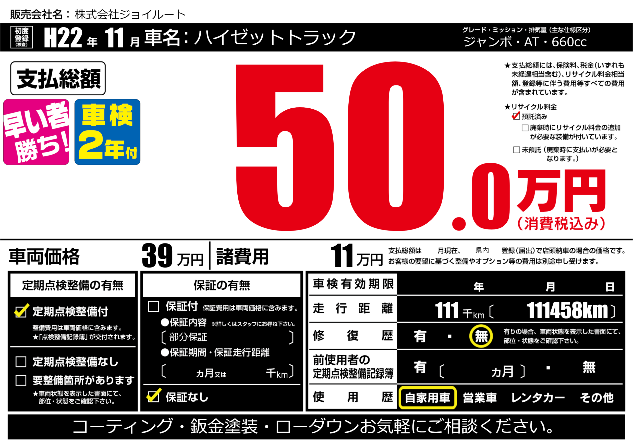 | 走行キロ | 11.1万km | 初年度登録 | H22年11月 |