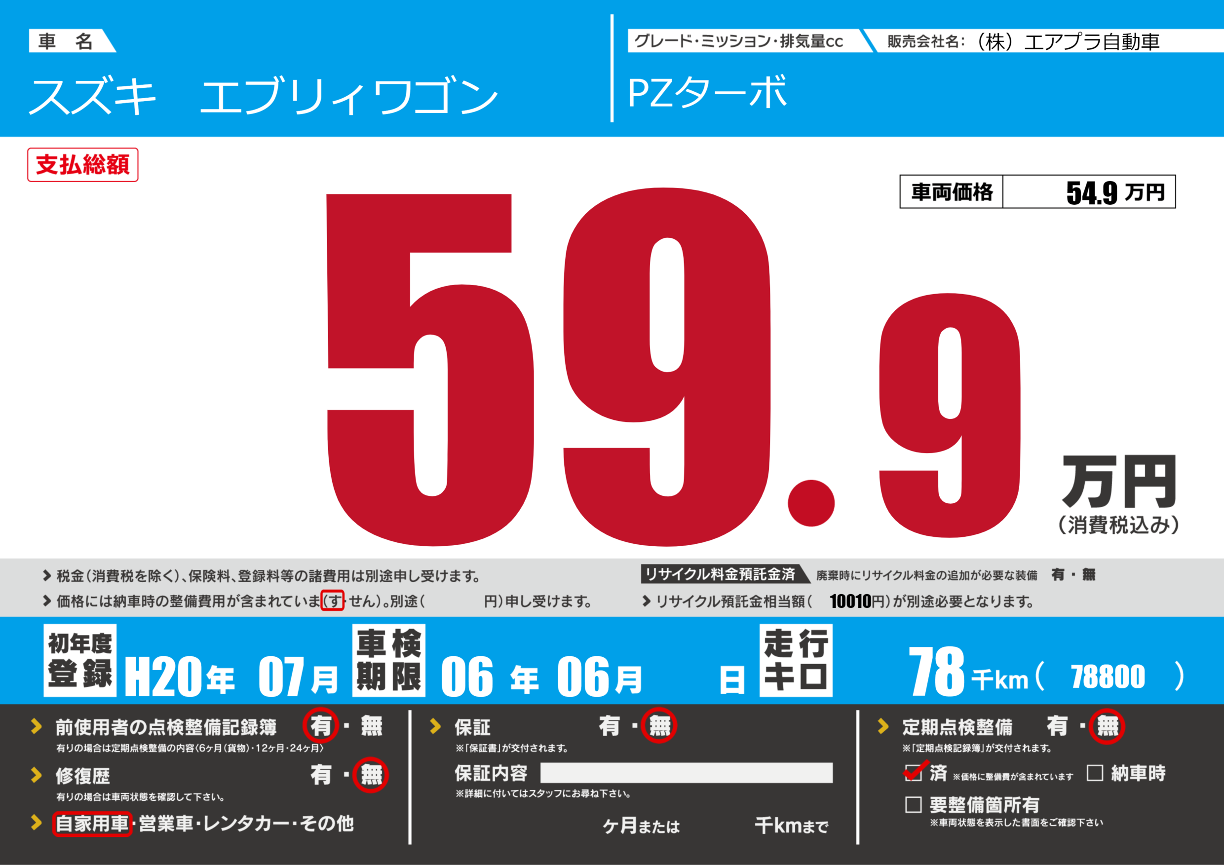 | 車名 | スズキ エブリィワゴン | グレード ミッション 排気量 |