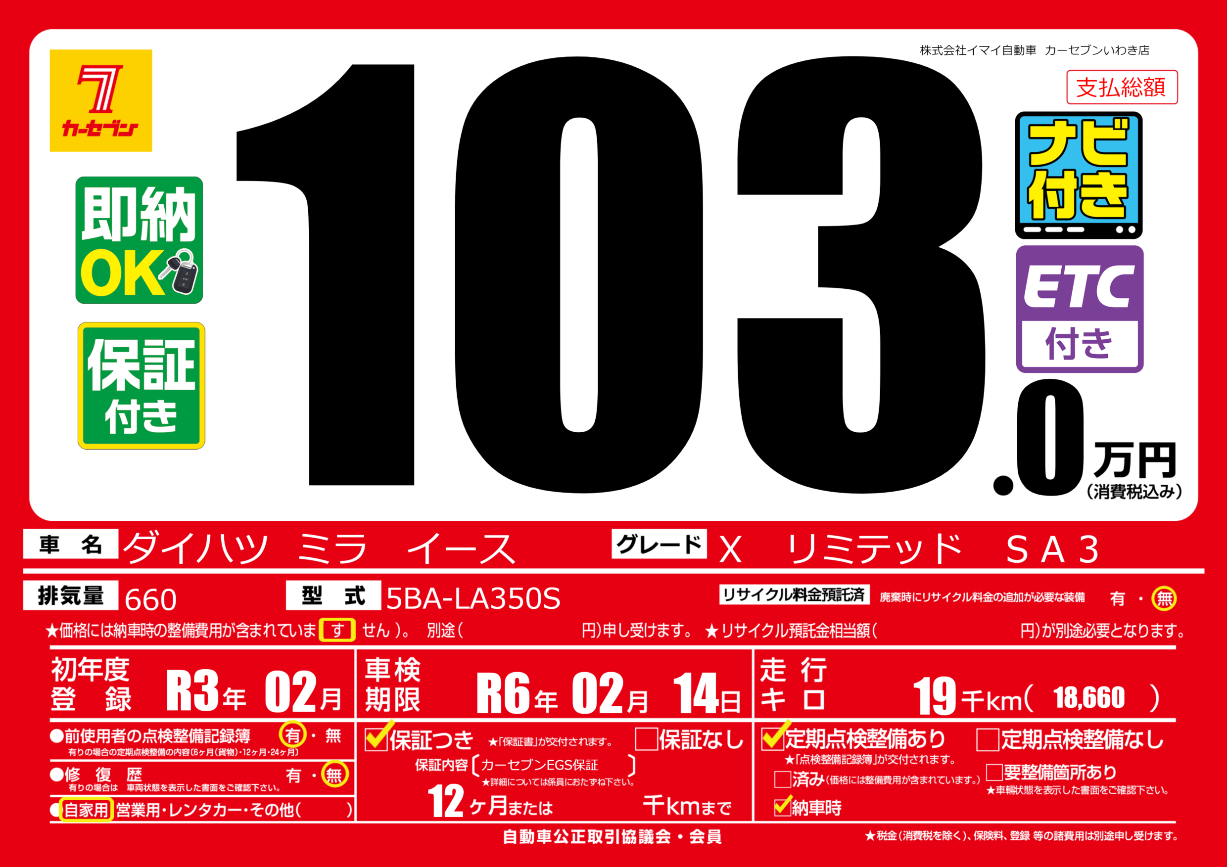 | 車名 | ダイハツ ミラ イース | グレード ミッション 排気量 |