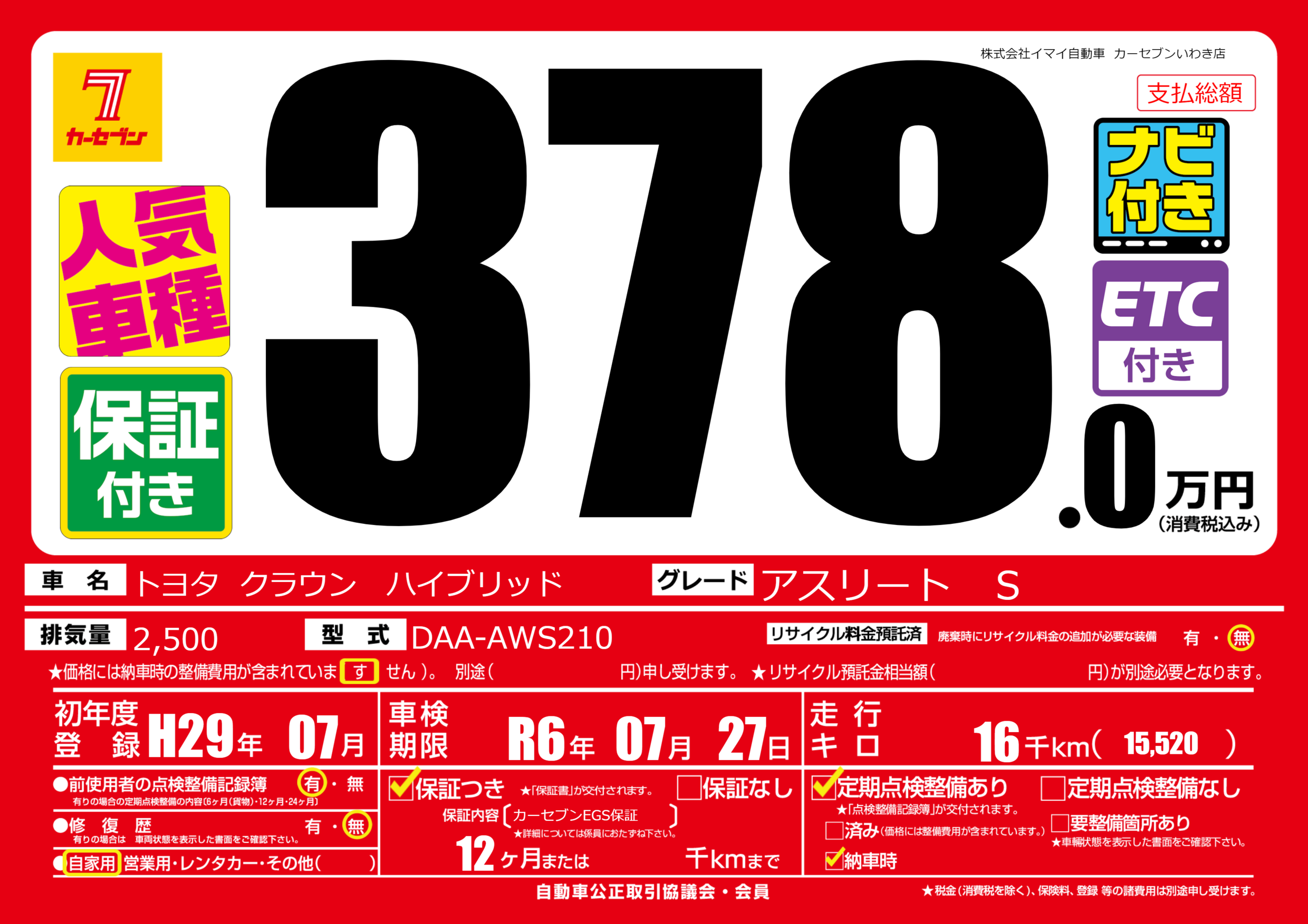 保証付き 保証内容(カーセブンEGS保証) 12ヶ月または千km |