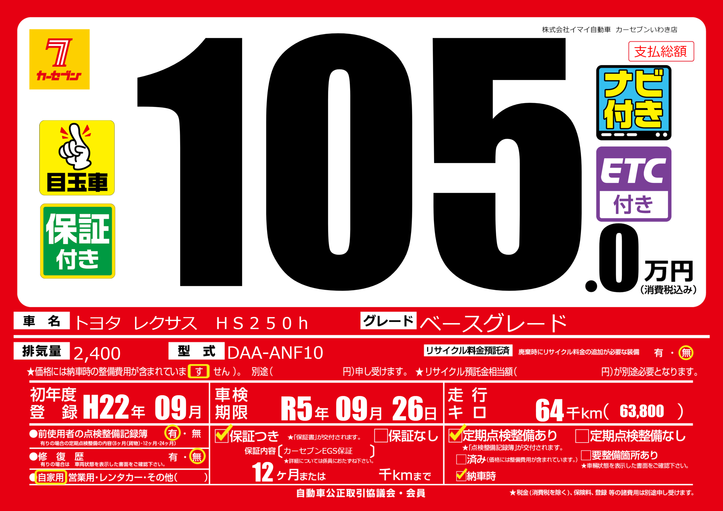 | 初年度登録 | H22年09月 | ||