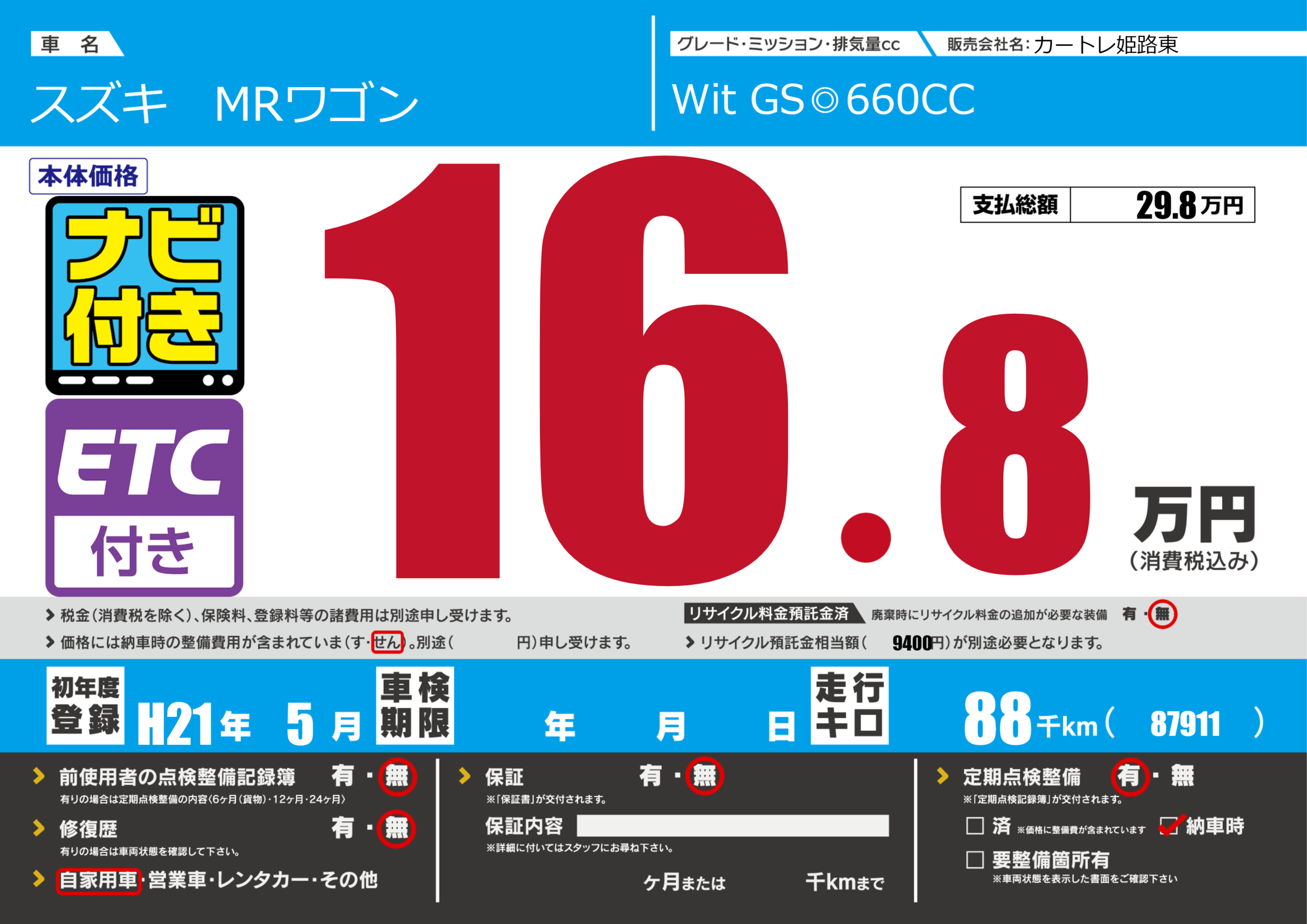 | 走行キロ | 8.8万km | 初年度登録 | H21年5月 |