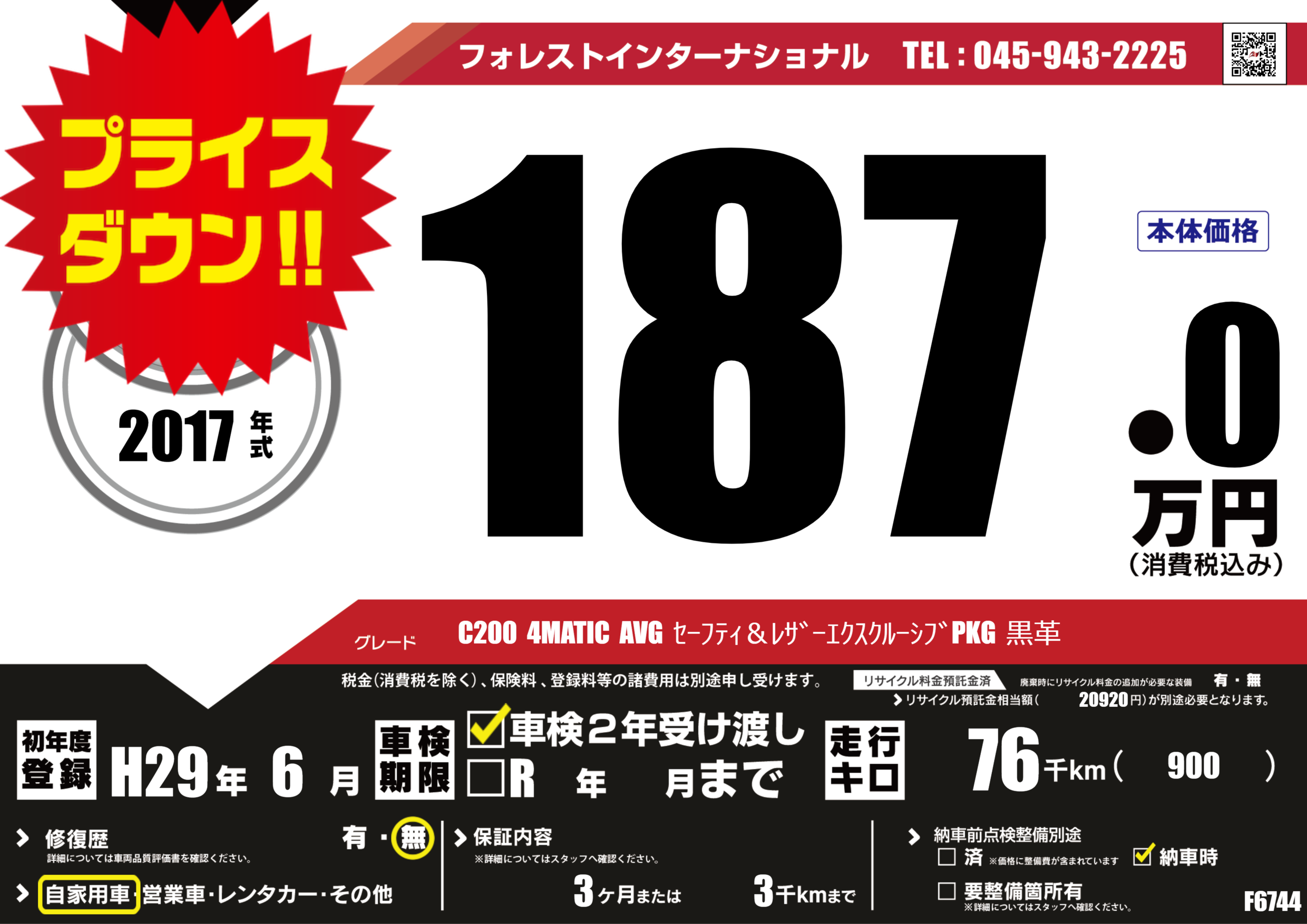 | 走行キロ | 7.6万km | 初年度登録 | H29年6月 |
