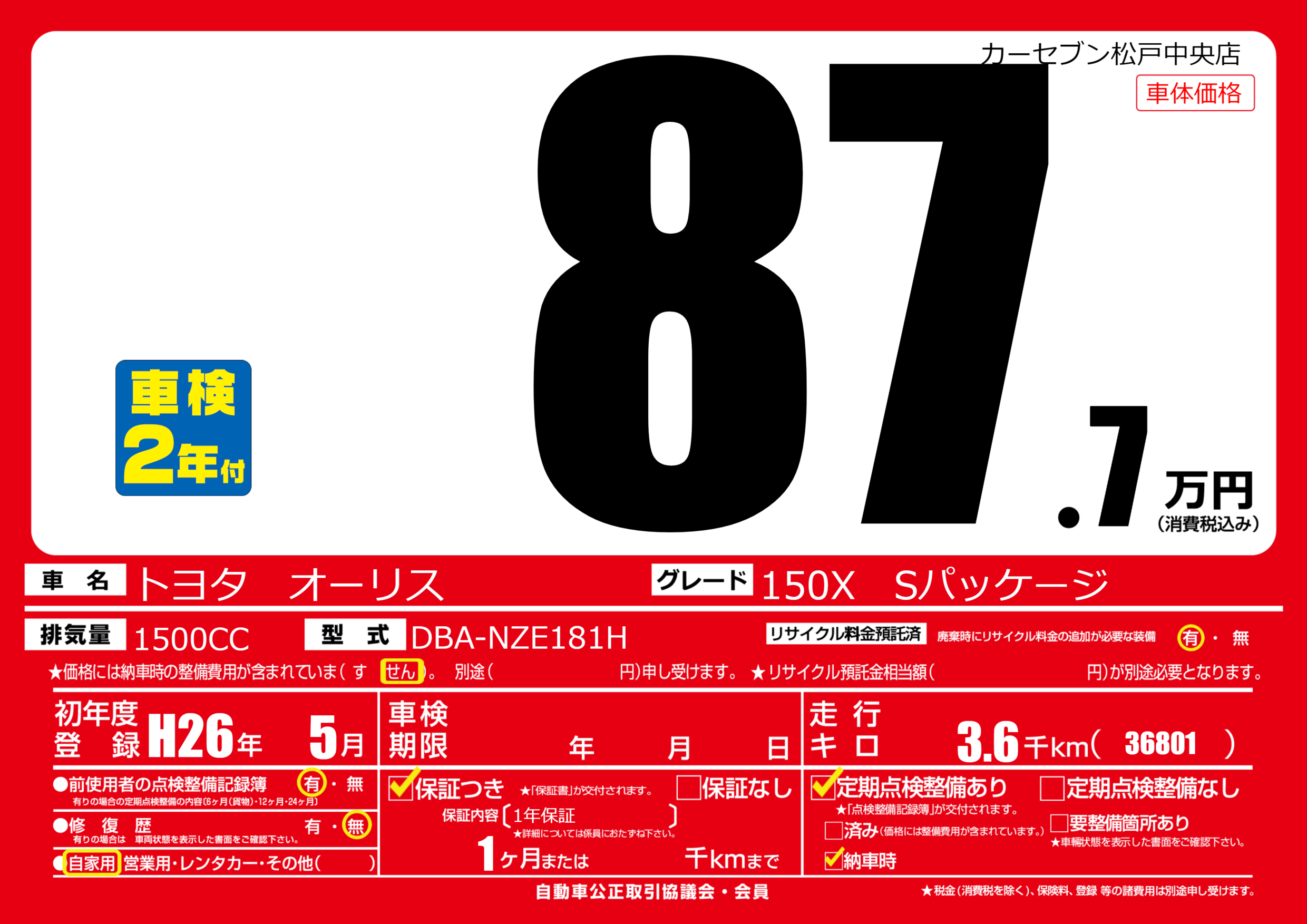 | 走行キロ | 0.3万km | 初年度登録 | H26年5月 |