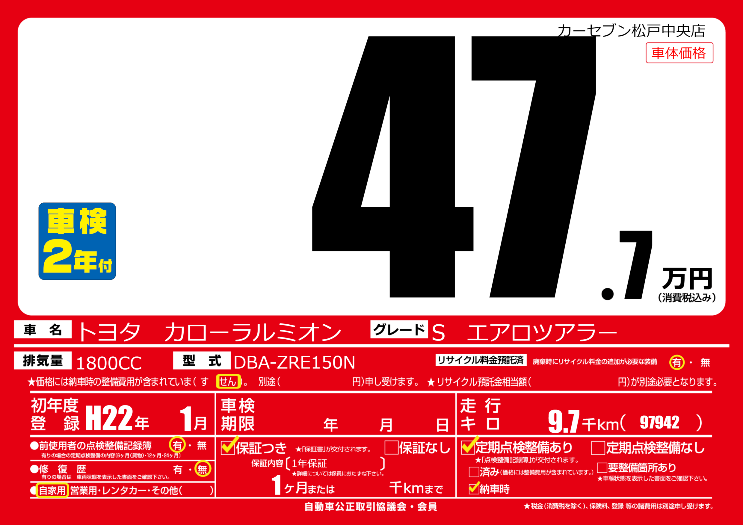 | 車名 | トヨタ カローラルミオン | グレード ミッション 排気量 |