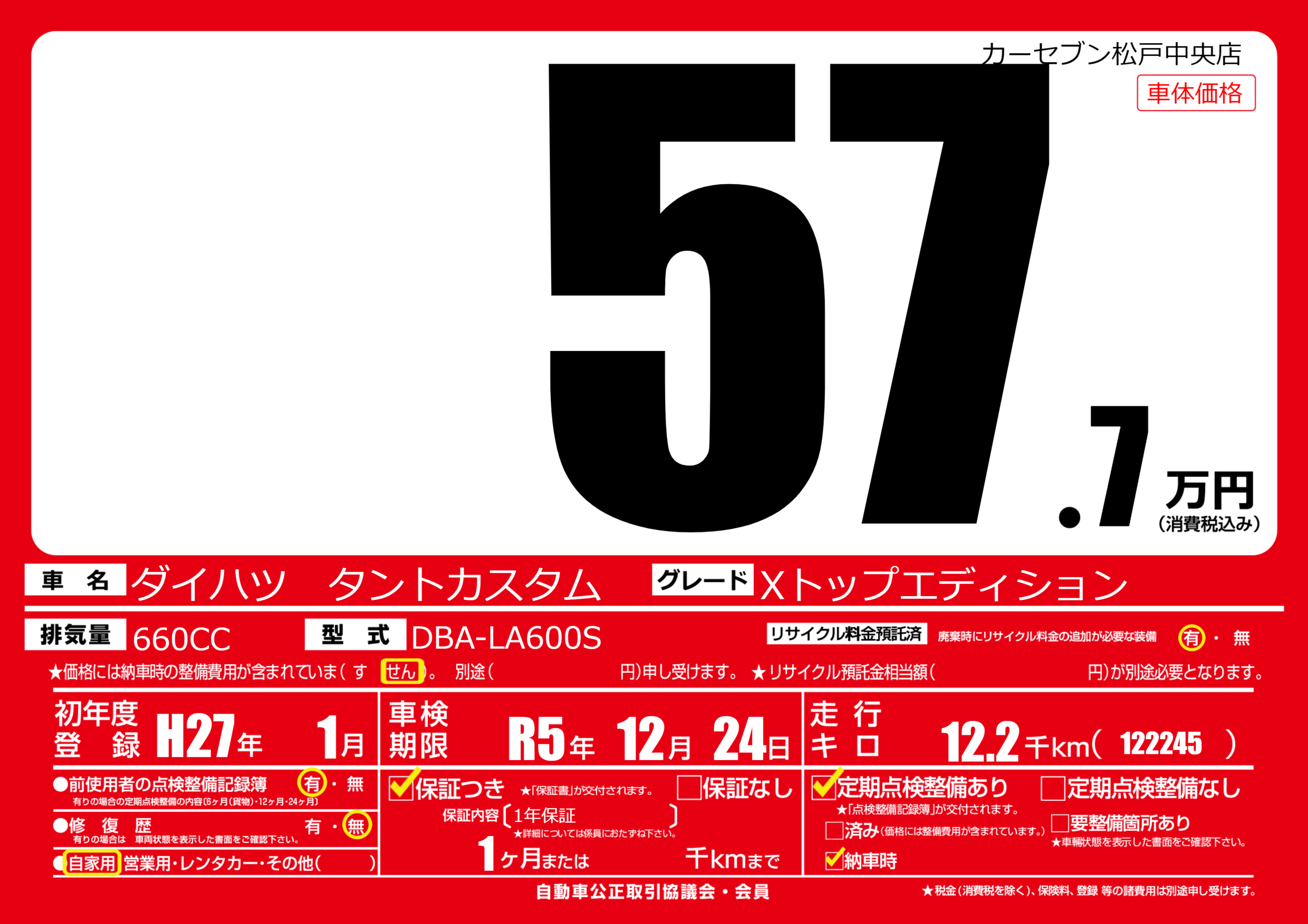 | 車名 | ダイハツ タントカスタム | グレード ミッション 排気量 |