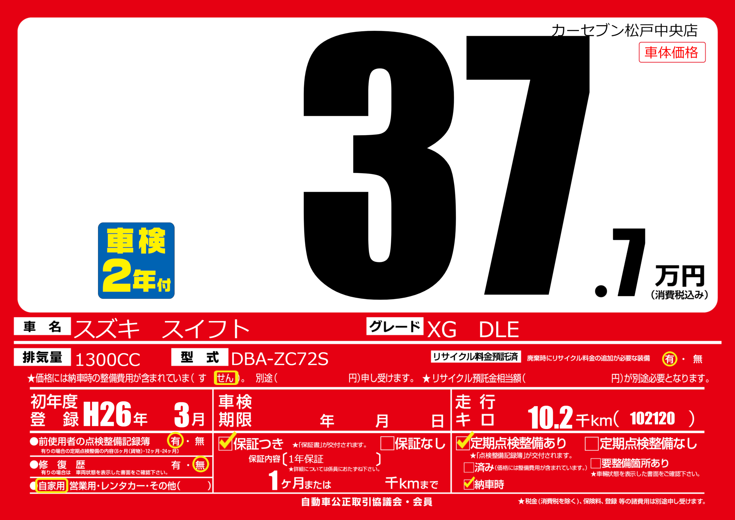 | 走行キロ | 1万km | 初年度登録 | H26年3月 |