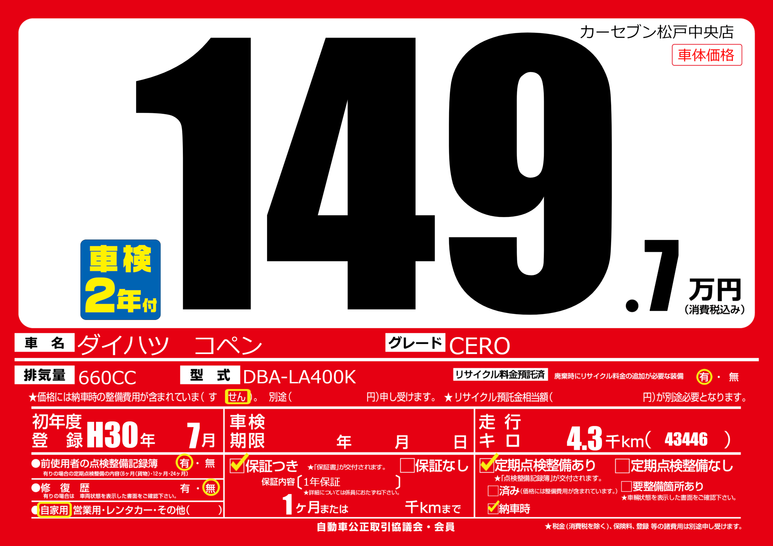 | 車名 | ダイハツ コペン | グレード ミッション 排気量 |