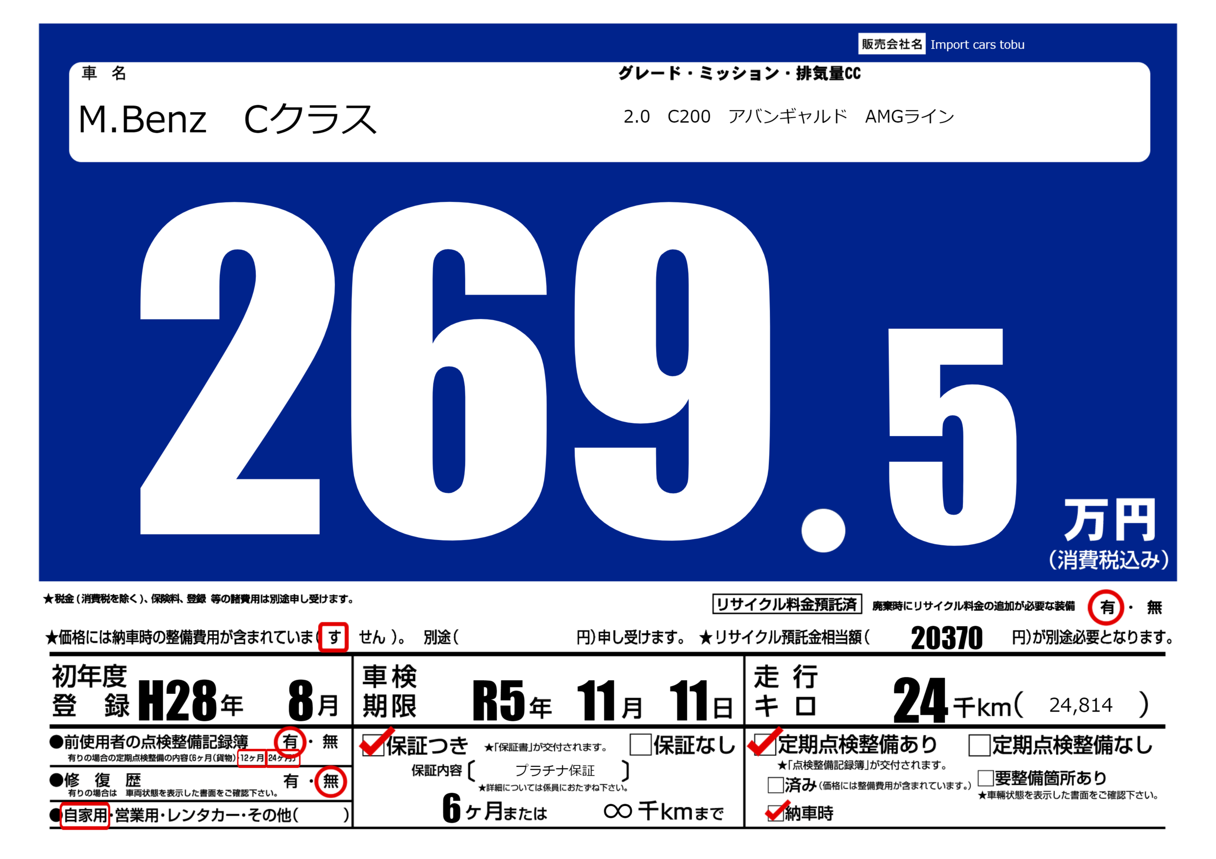 | 車名 | M.Benz Cクラス | グレード ミッション 排気量 |