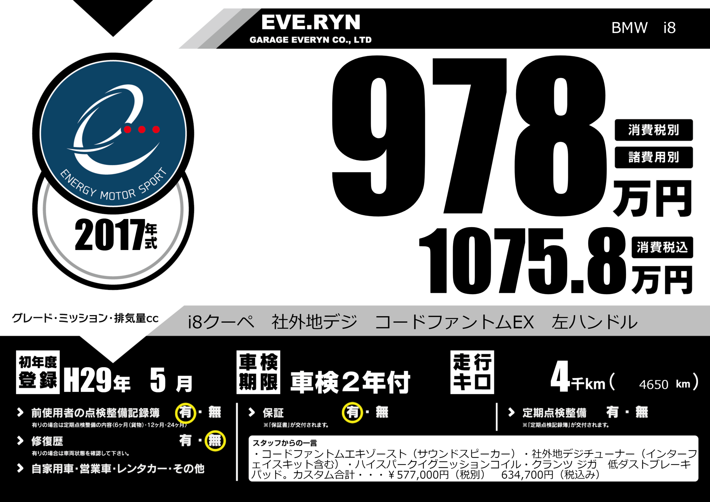 | 車名 | BMW i8 | グレード ミッション 排気量 |