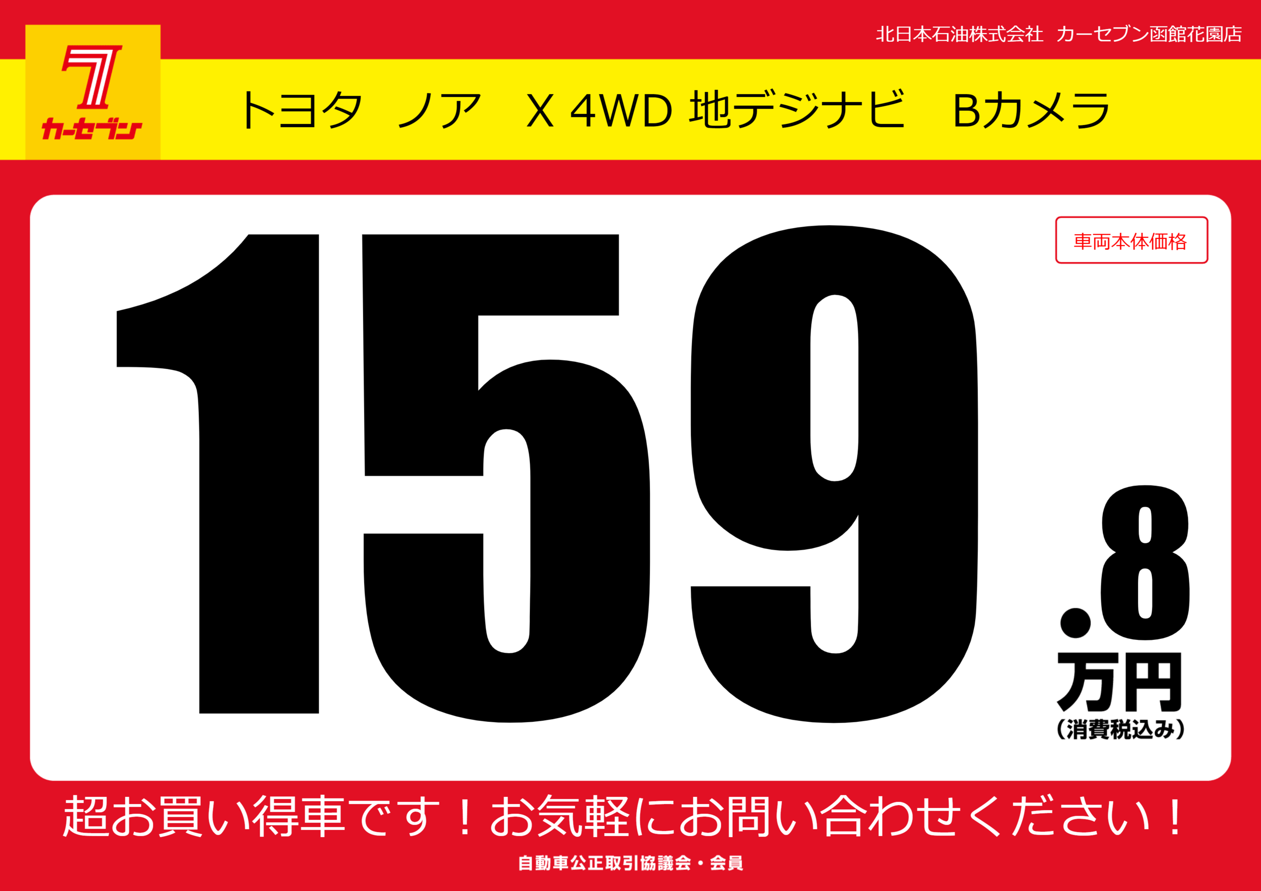 | 車名 | トヨタ ノア X 4WD 地デジナビ Bカメラ | グレード ミッション 排気量 |