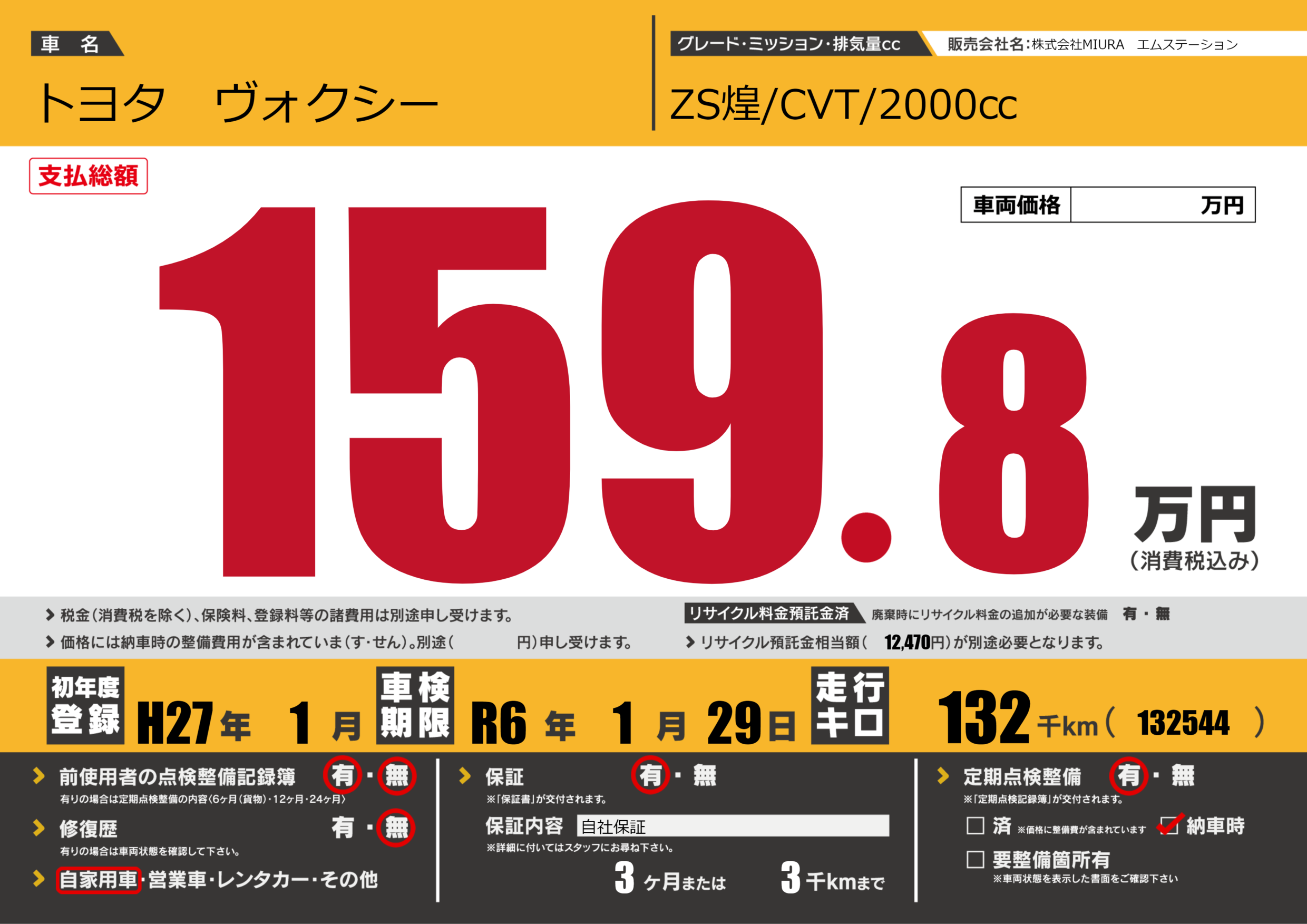 | 走行キロ | 13.2万km | 初年度登録 | H27年1月 |