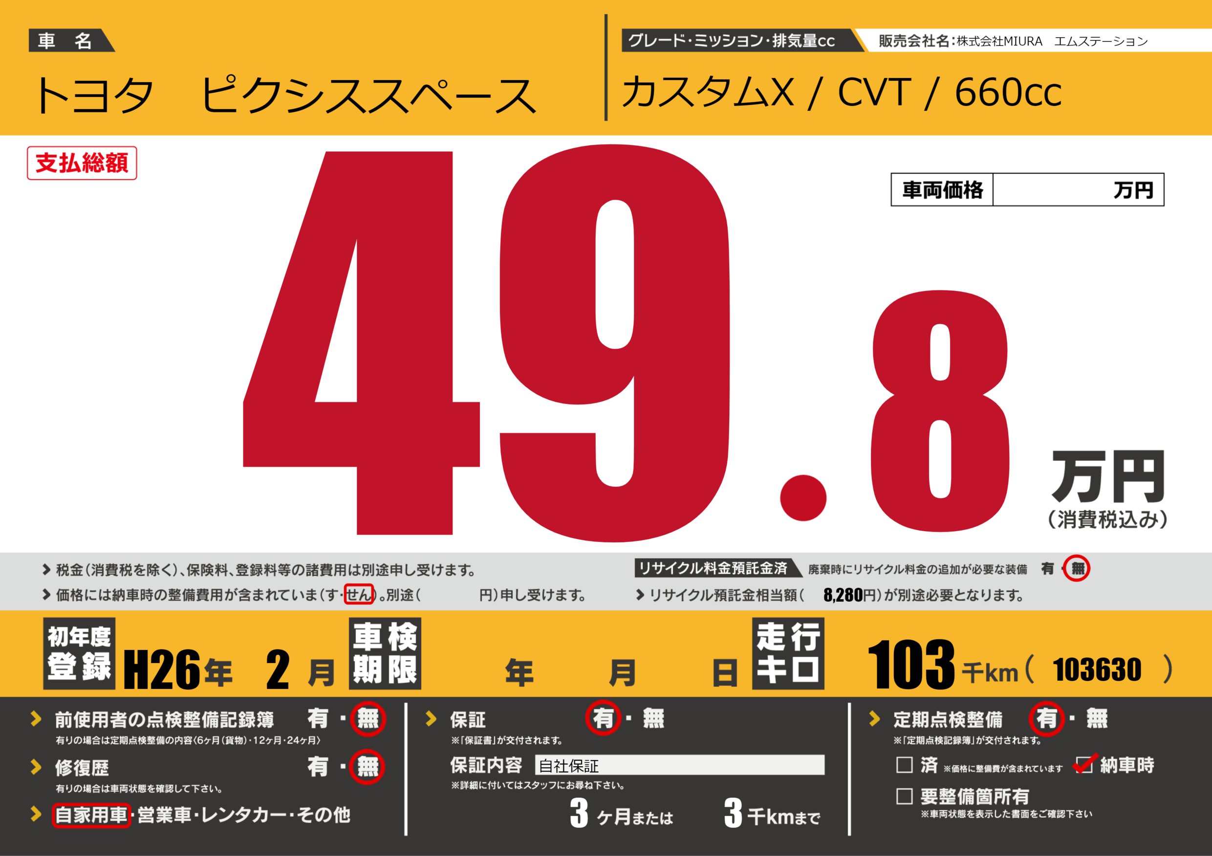 保証付き 保証内容(自社保証) 3ヶ月または3千km |