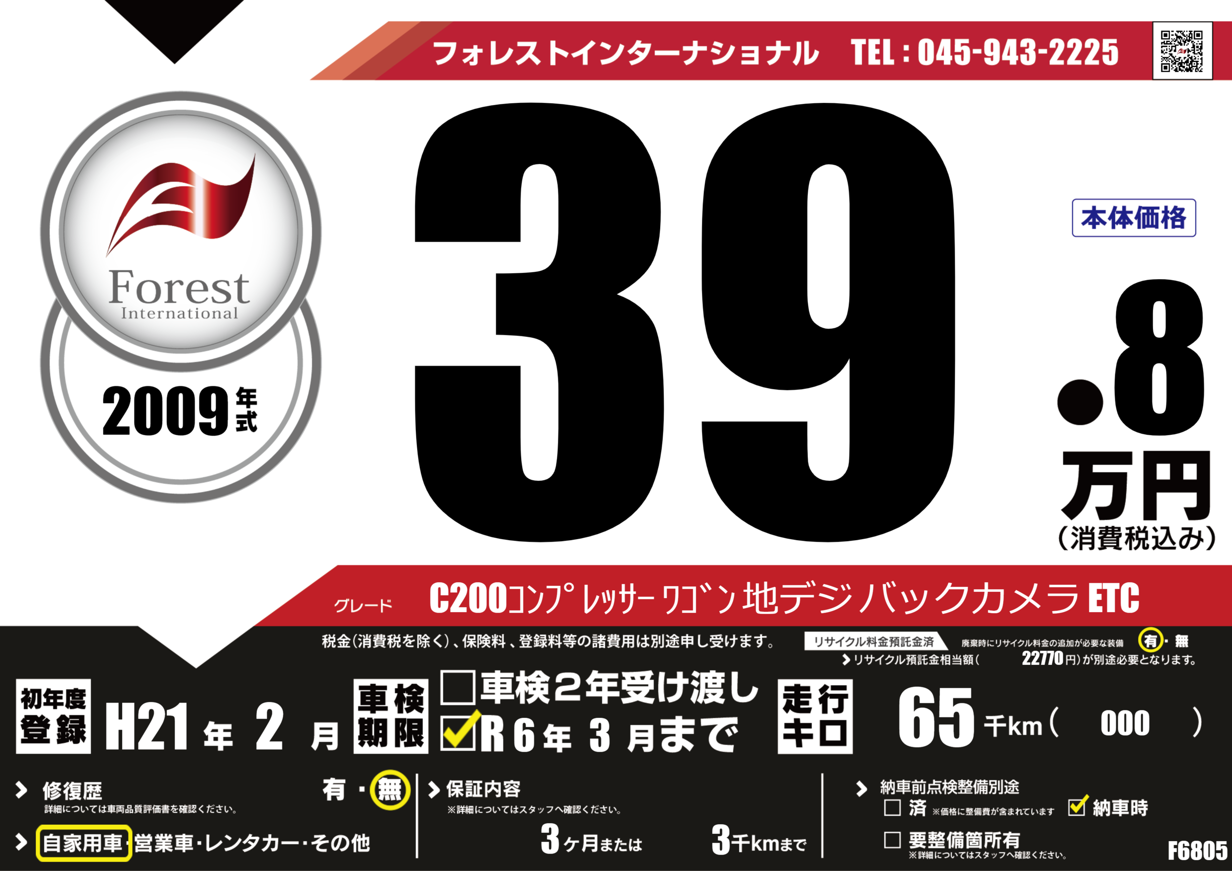 | 走行キロ | 6.5万km | 初年度登録 | H21年2月 |