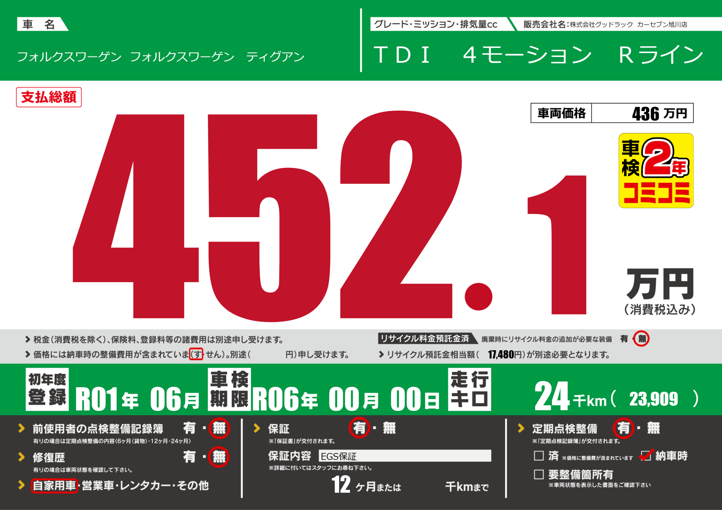 | 車名 | フォルクスワーゲン フォルクスワーゲン ティグアン | グレード ミッション 排気量 |