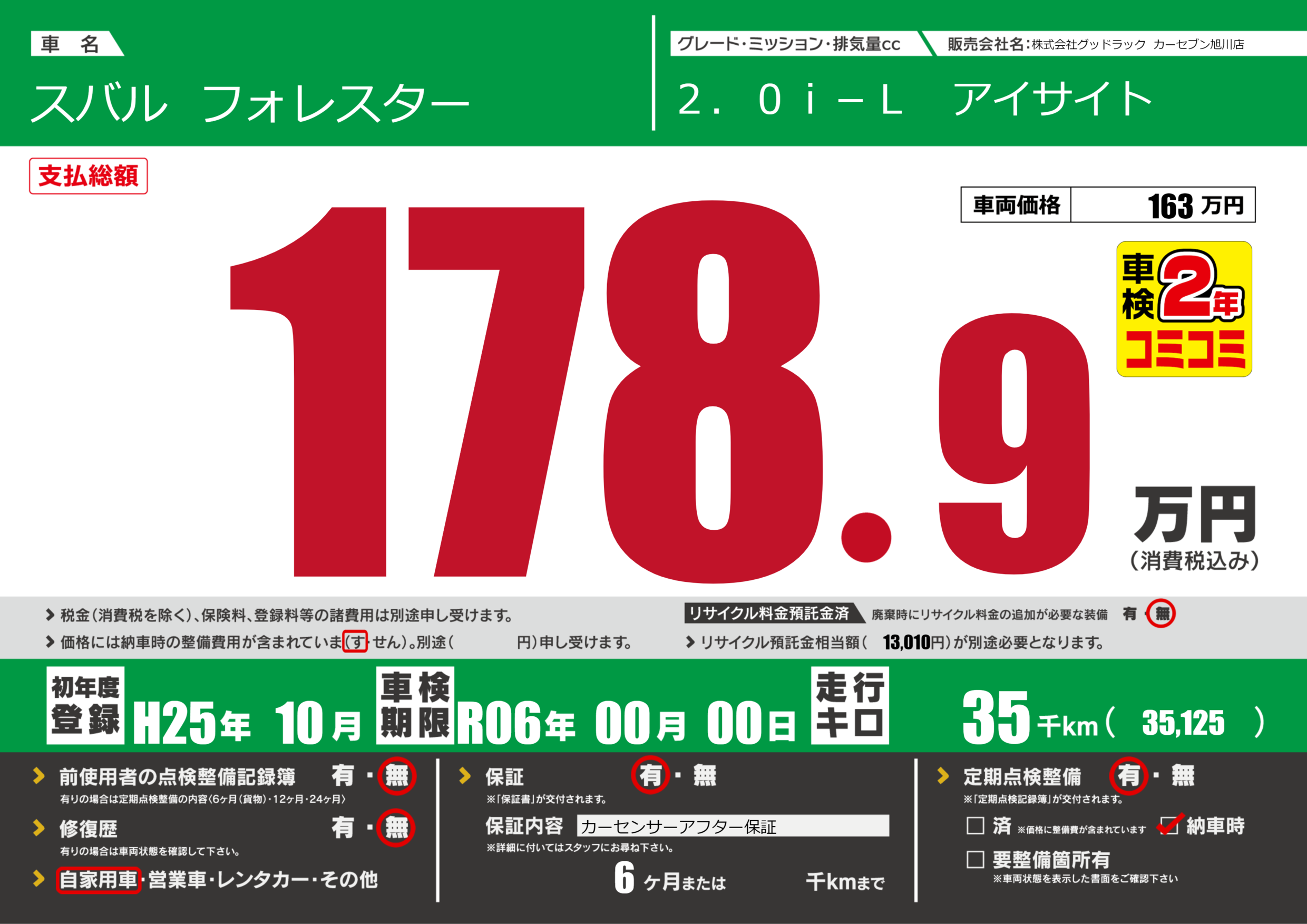 | 車名 | スバル フォレスター | グレード ミッション 排気量 |