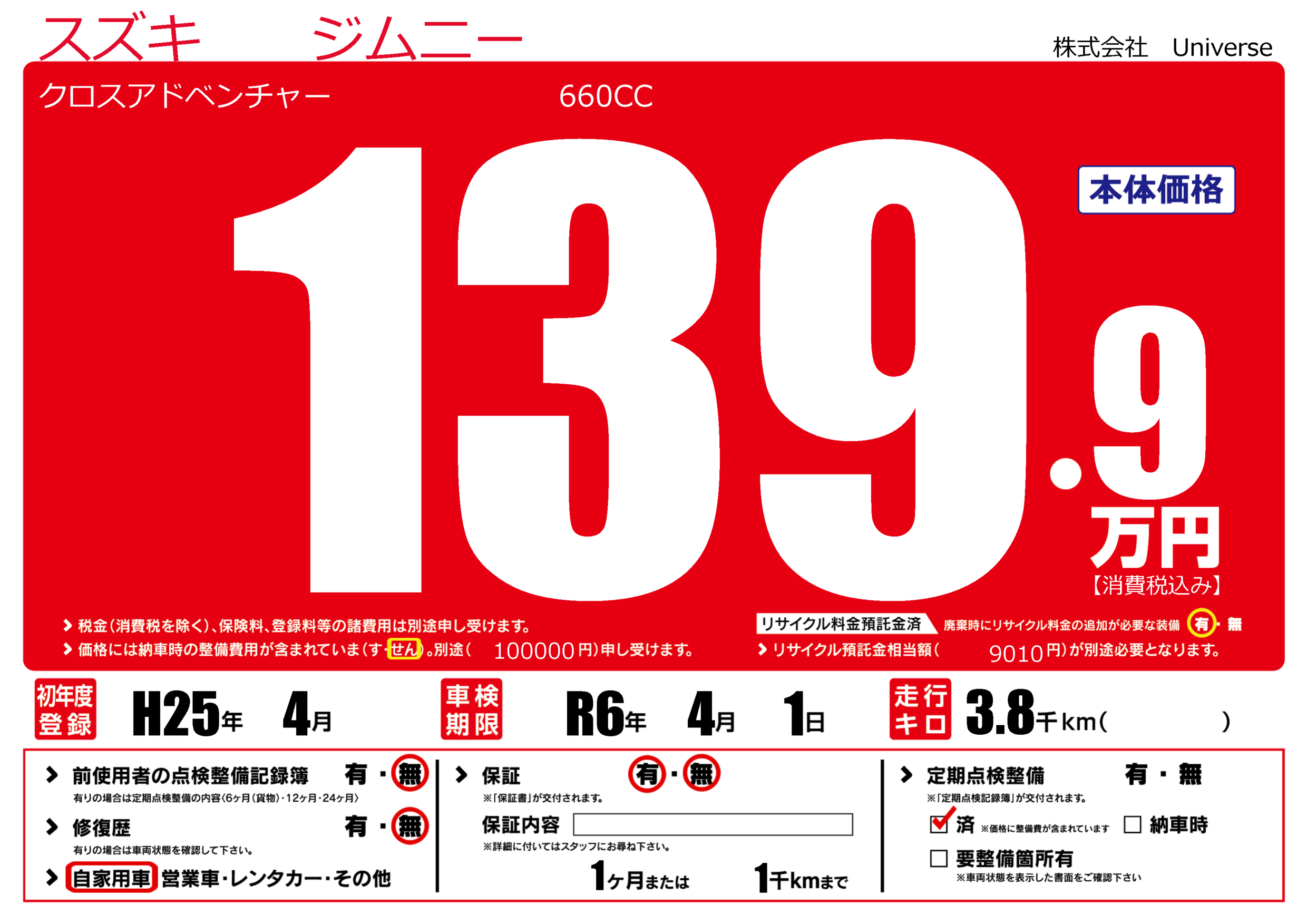 | 定期点検整備 | 定期点検整備済み | ||