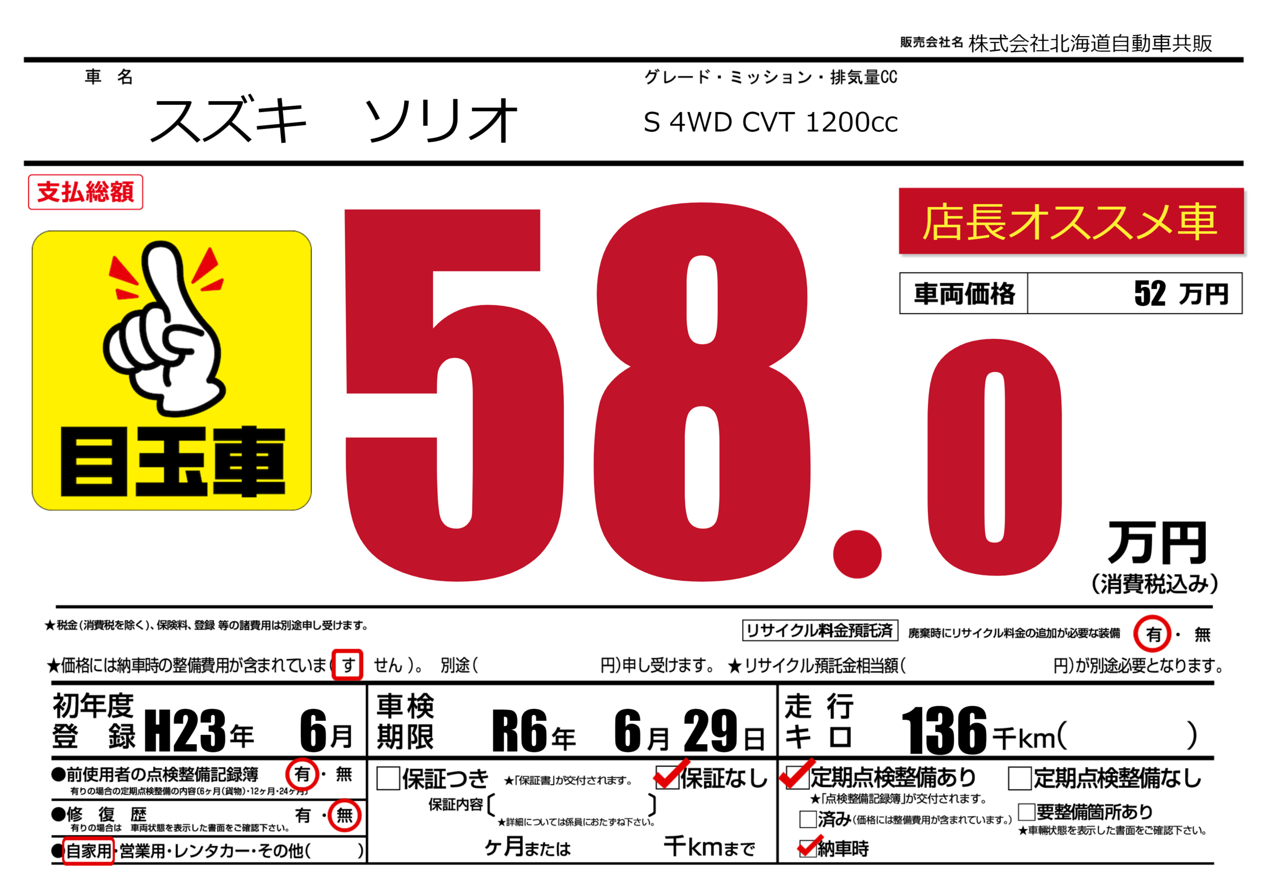 | 走行キロ | 13.6万km | 初年度登録 | H23年6月 |