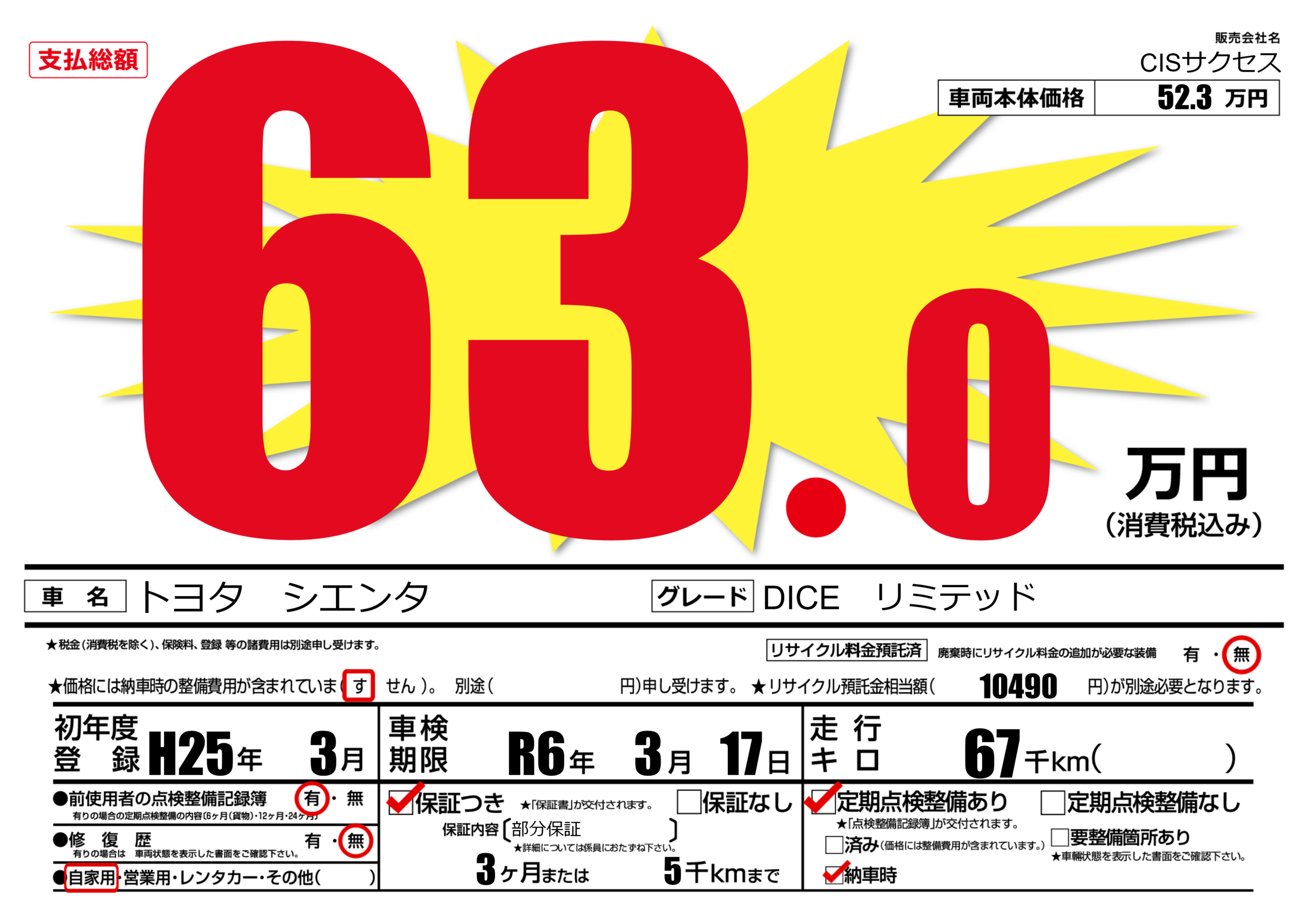 保証付き 保証内容(部分保証) 3ヶ月または(5)千kmまで |