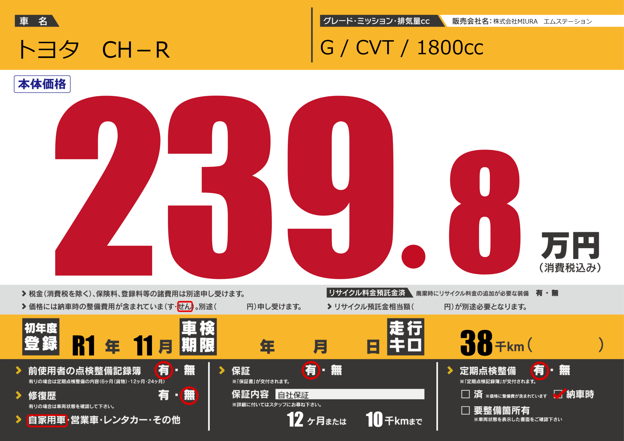 | 車名 | トヨタ CH-R | グレード ミッション 排気量 |