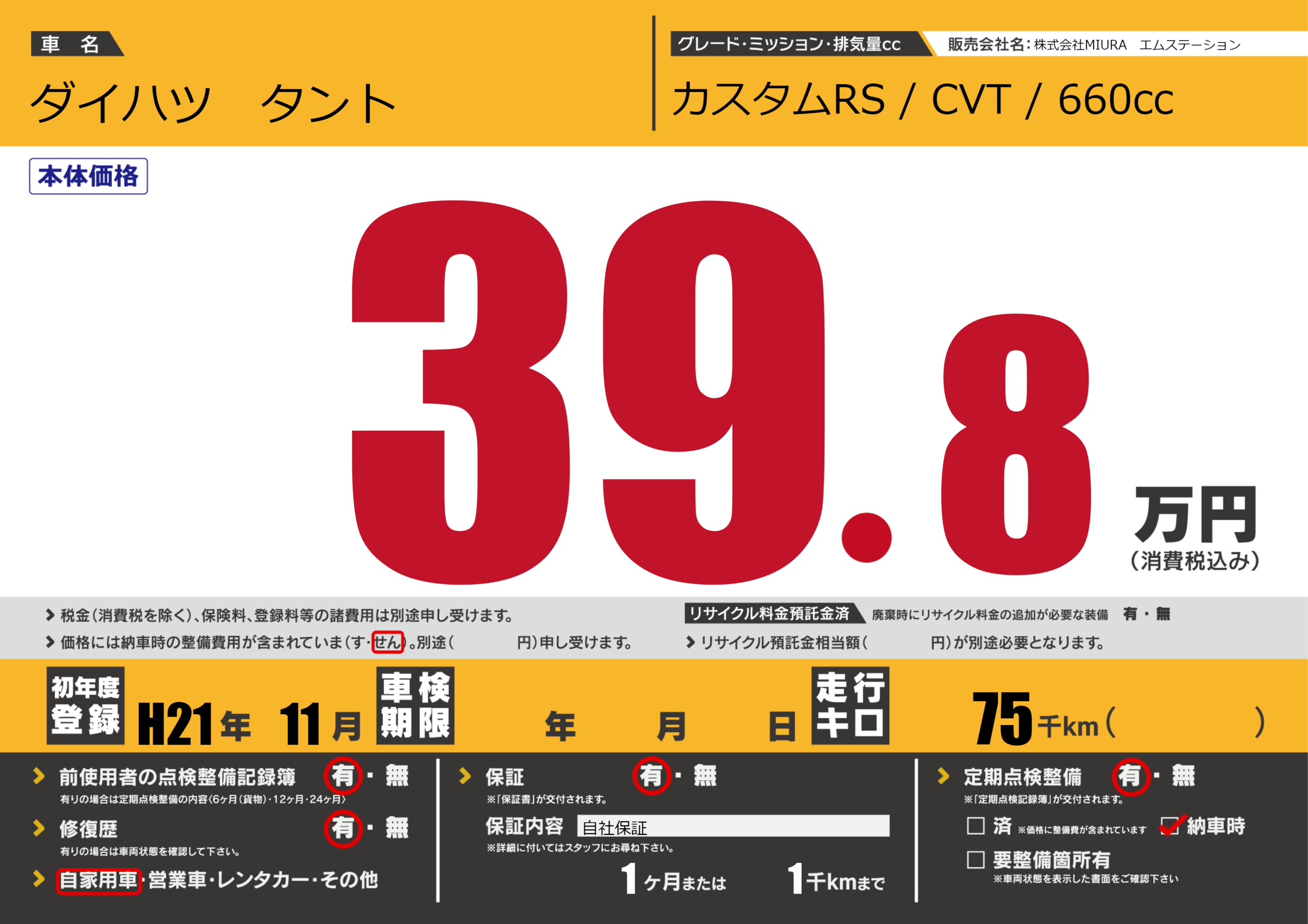 | 車名 | ダイハツ タント | グレード ミッション 排気量 |