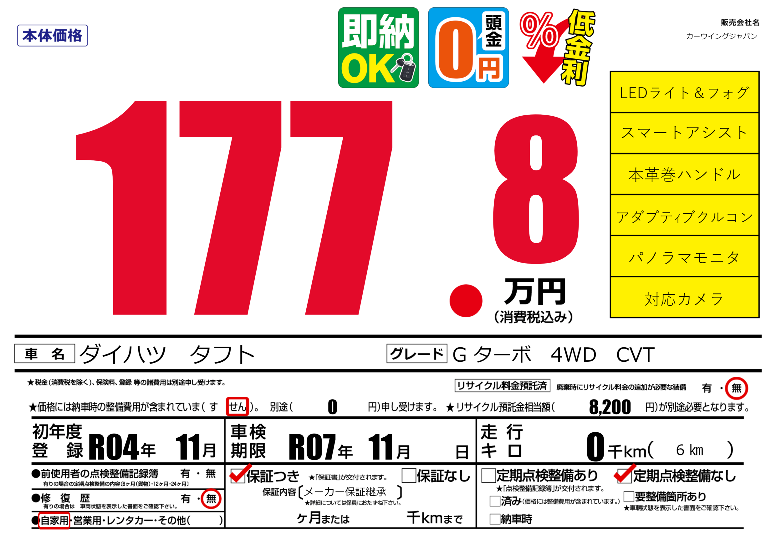 | 車名 | ダイハツ タフト | グレード ミッション 排気量 |