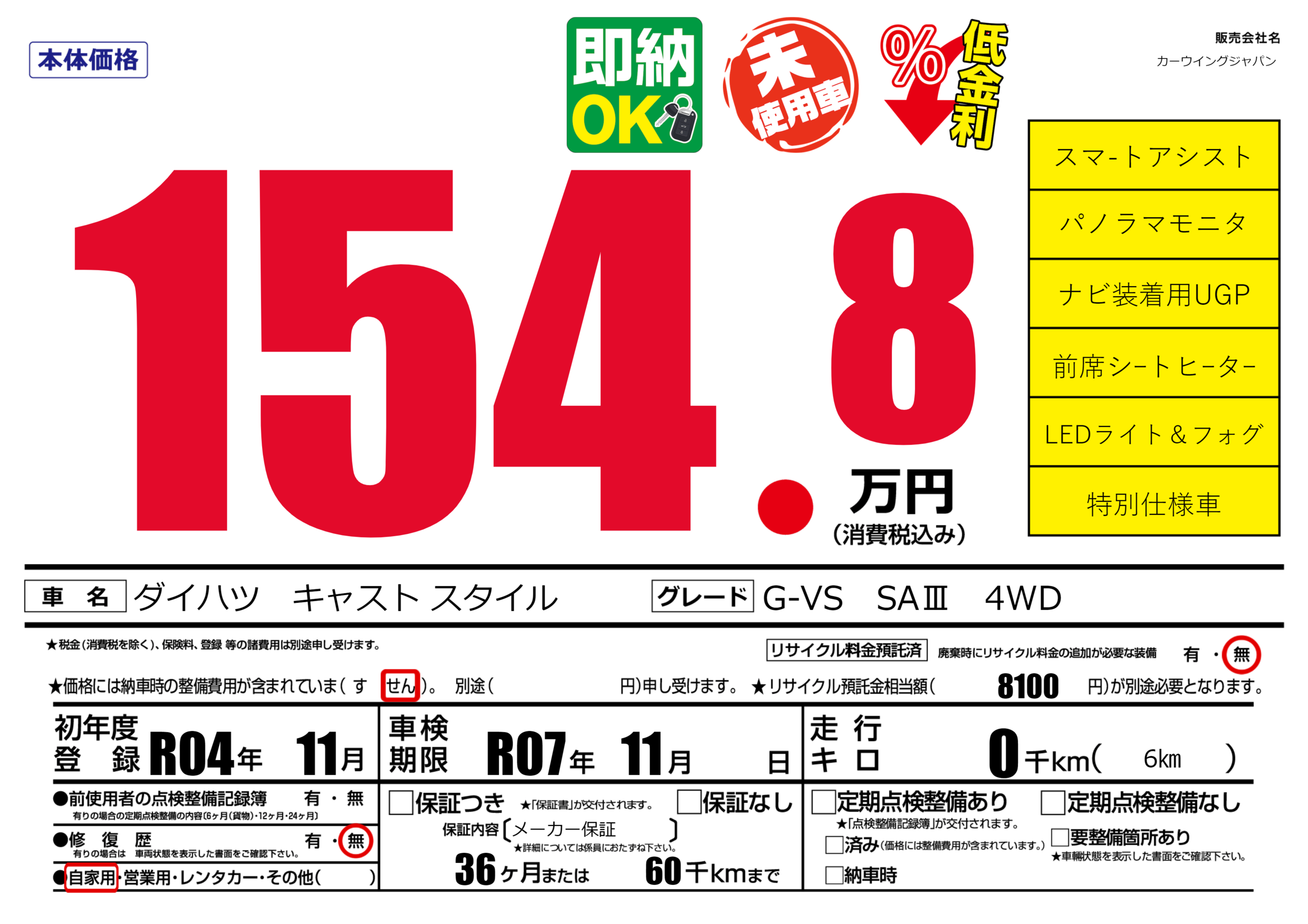 | 走行キロ | - | 初年度登録 | R04年11月 |