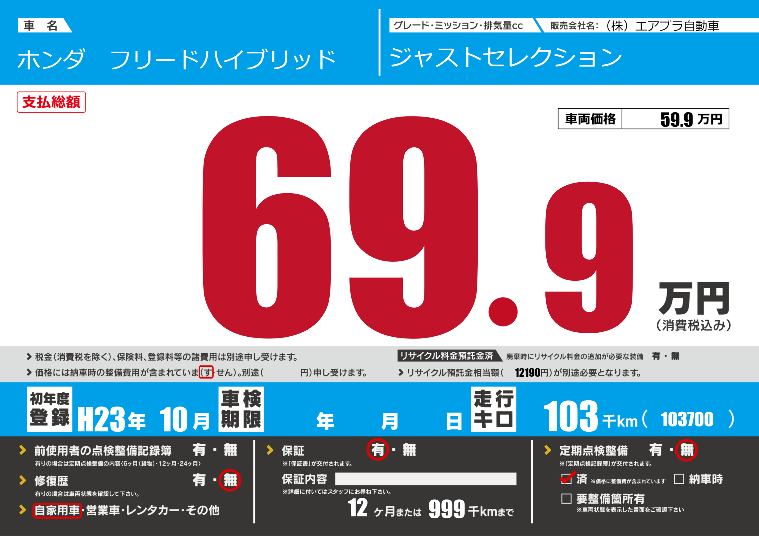 保証付き 保証内容(---) 12ヶ月または(999)千kmまで |