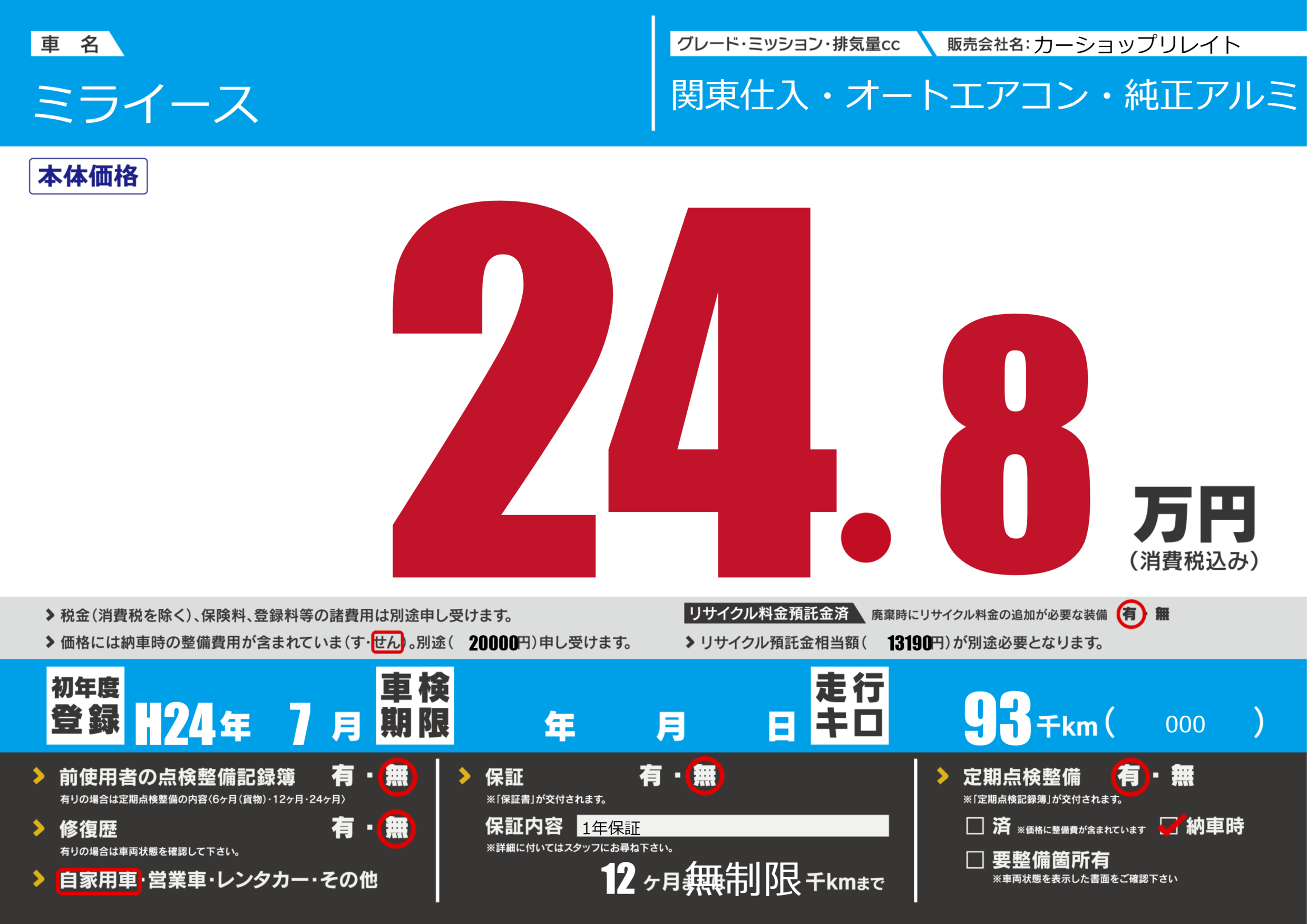 | 走行キロ | 9.3万km | 初年度登録 | H24年7月 |