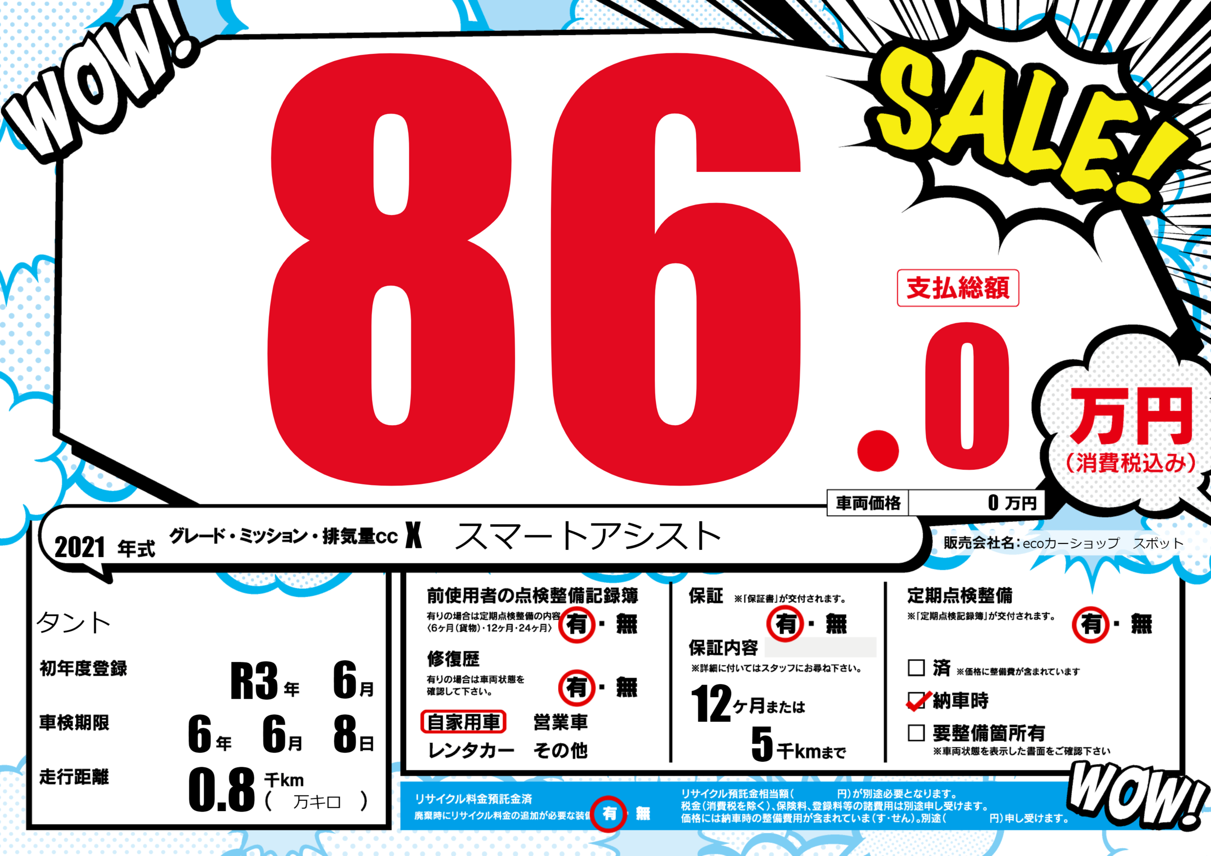 | 走行キロ | - | 初年度登録 | R3年6月 |