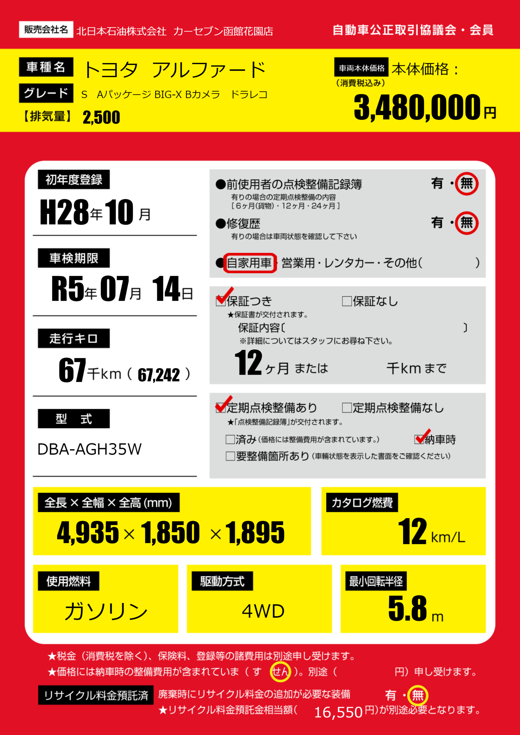 保証付き 保証内容(---) 12ヶ月または()千kmまで |