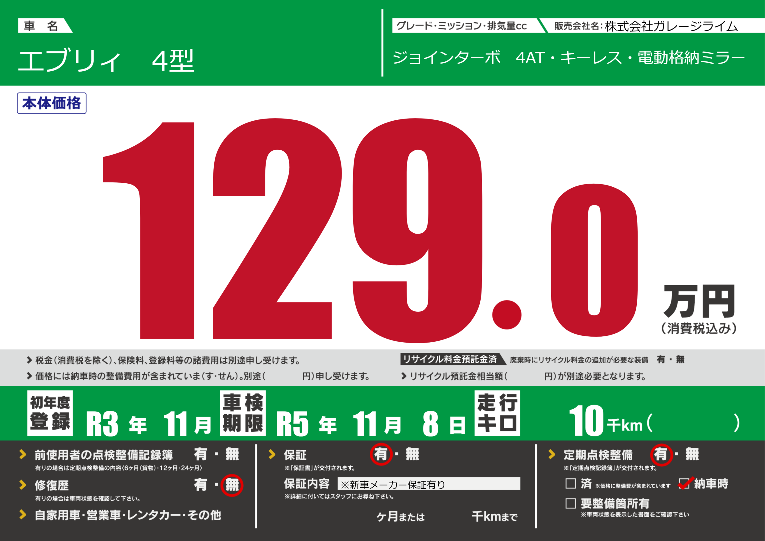 | 車名 | エブリィ 4型 | グレード ミッション 排気量 |