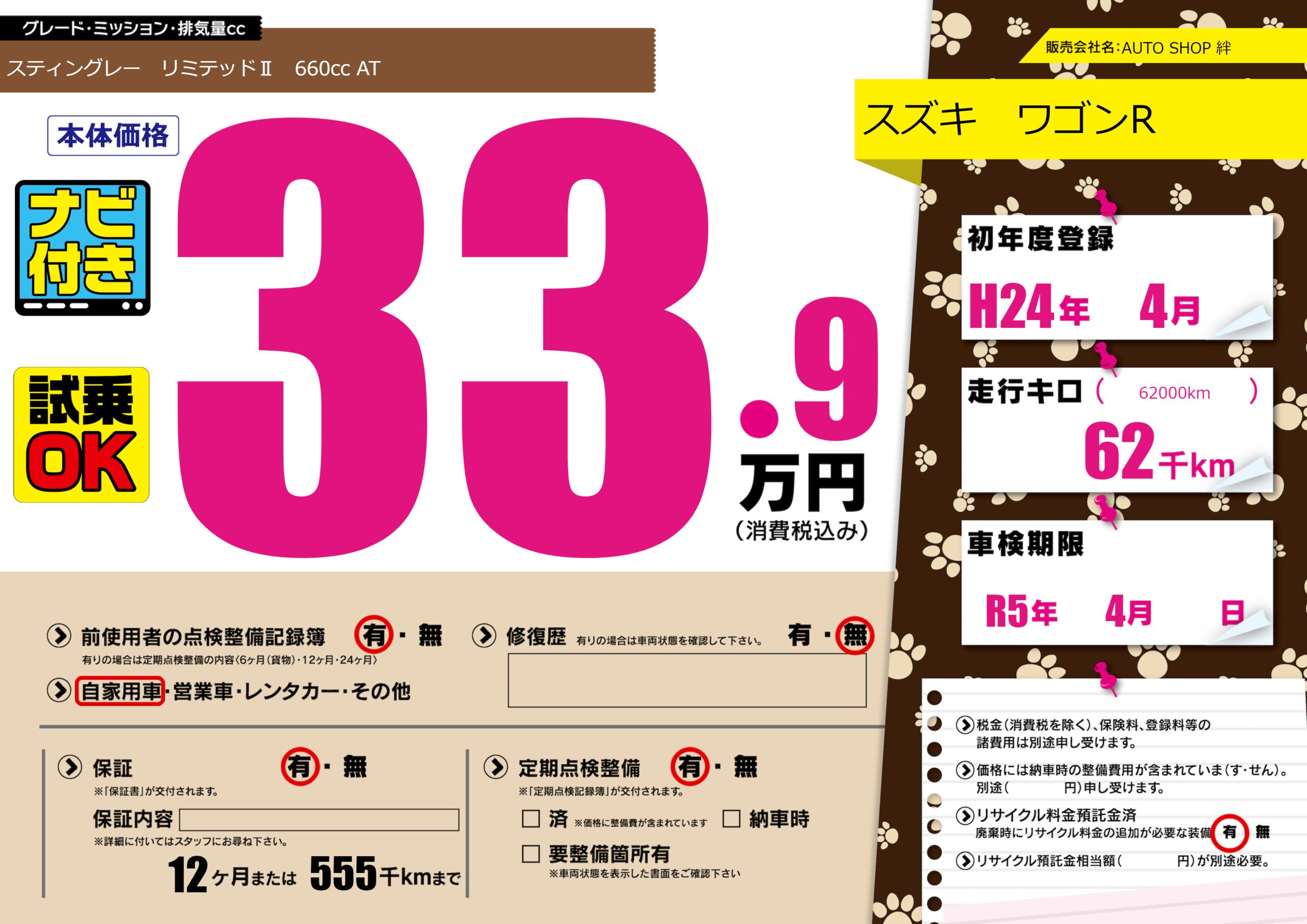 なし | 車検制限 | R5年4月---月 |