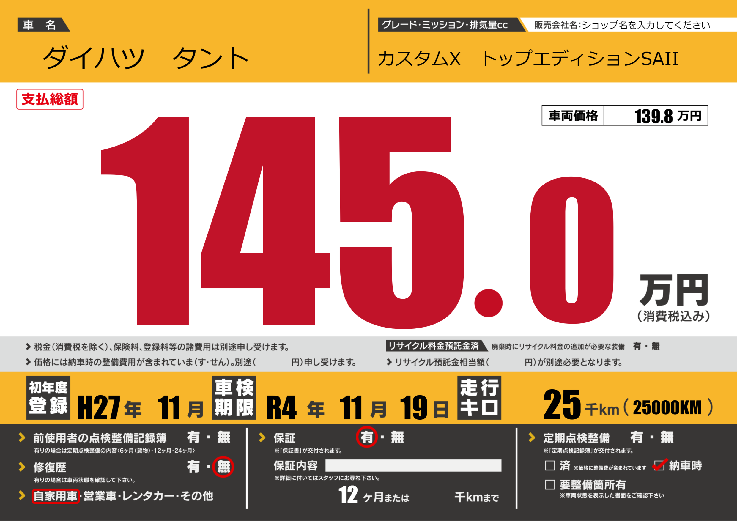 | 車名 | ダイハツ タント | グレード ミッション 排気量 |