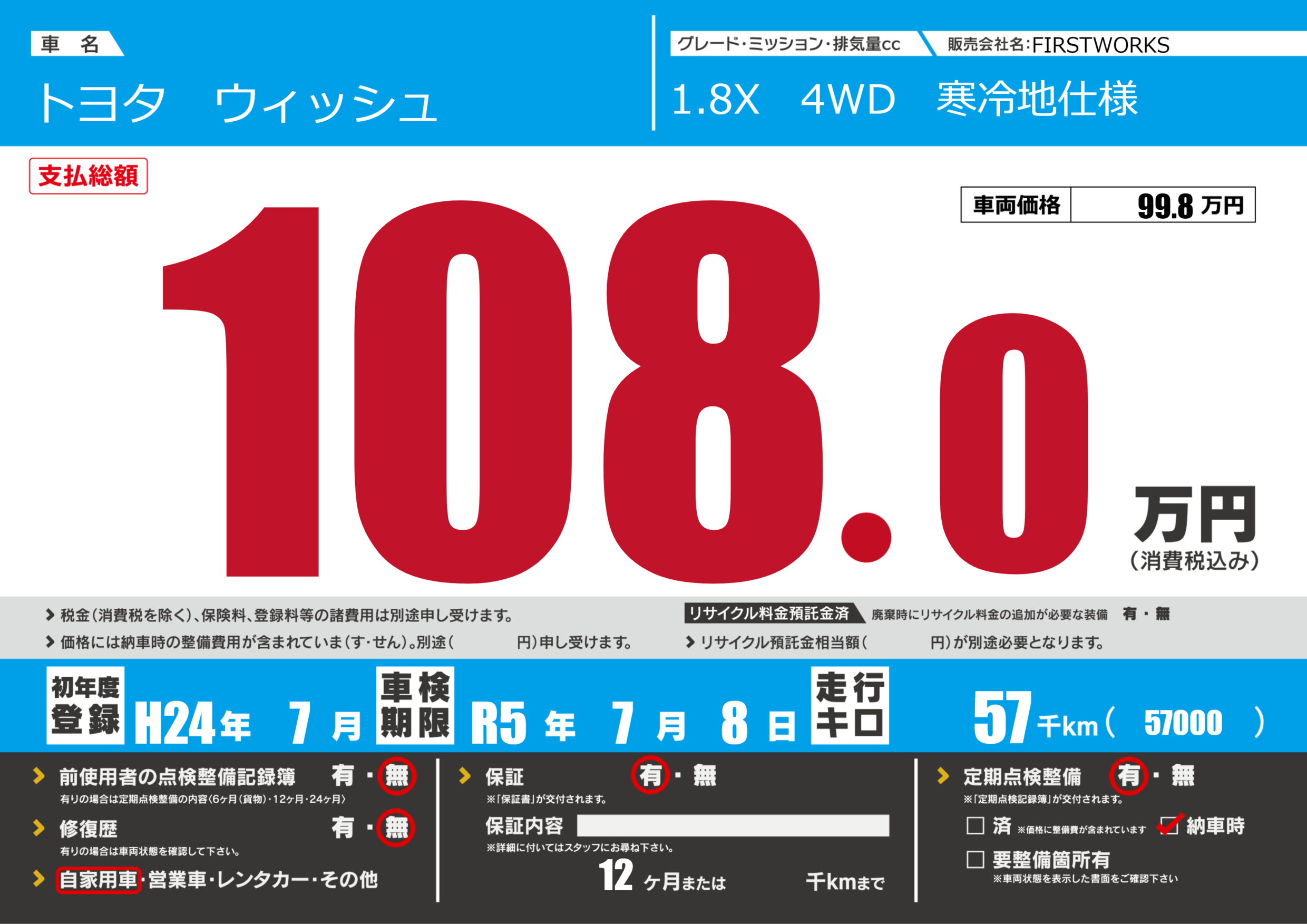| 走行キロ | 5.7万km | 初年度登録 | H24年7月 |