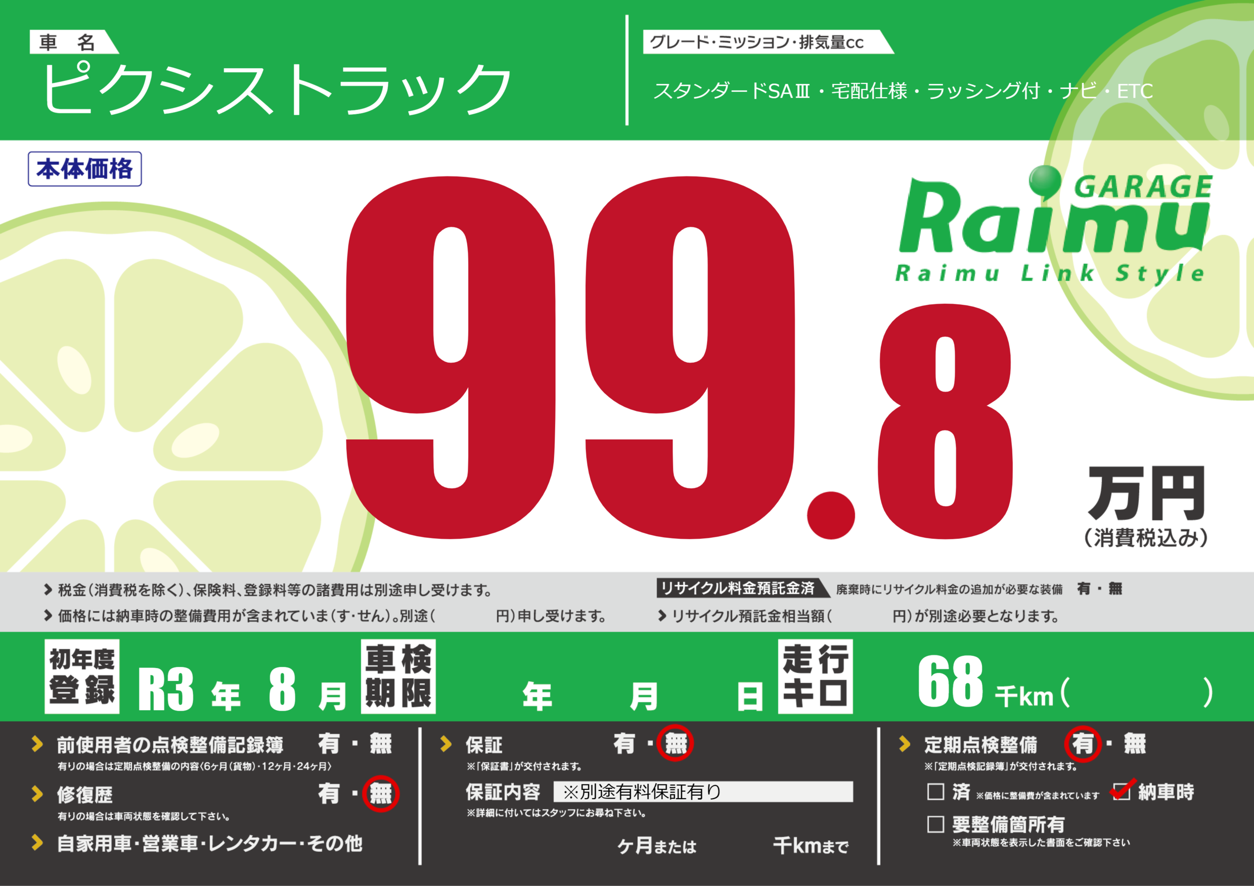 | 定期点検整備 | 定期点検整備あり 納車時あり | ||