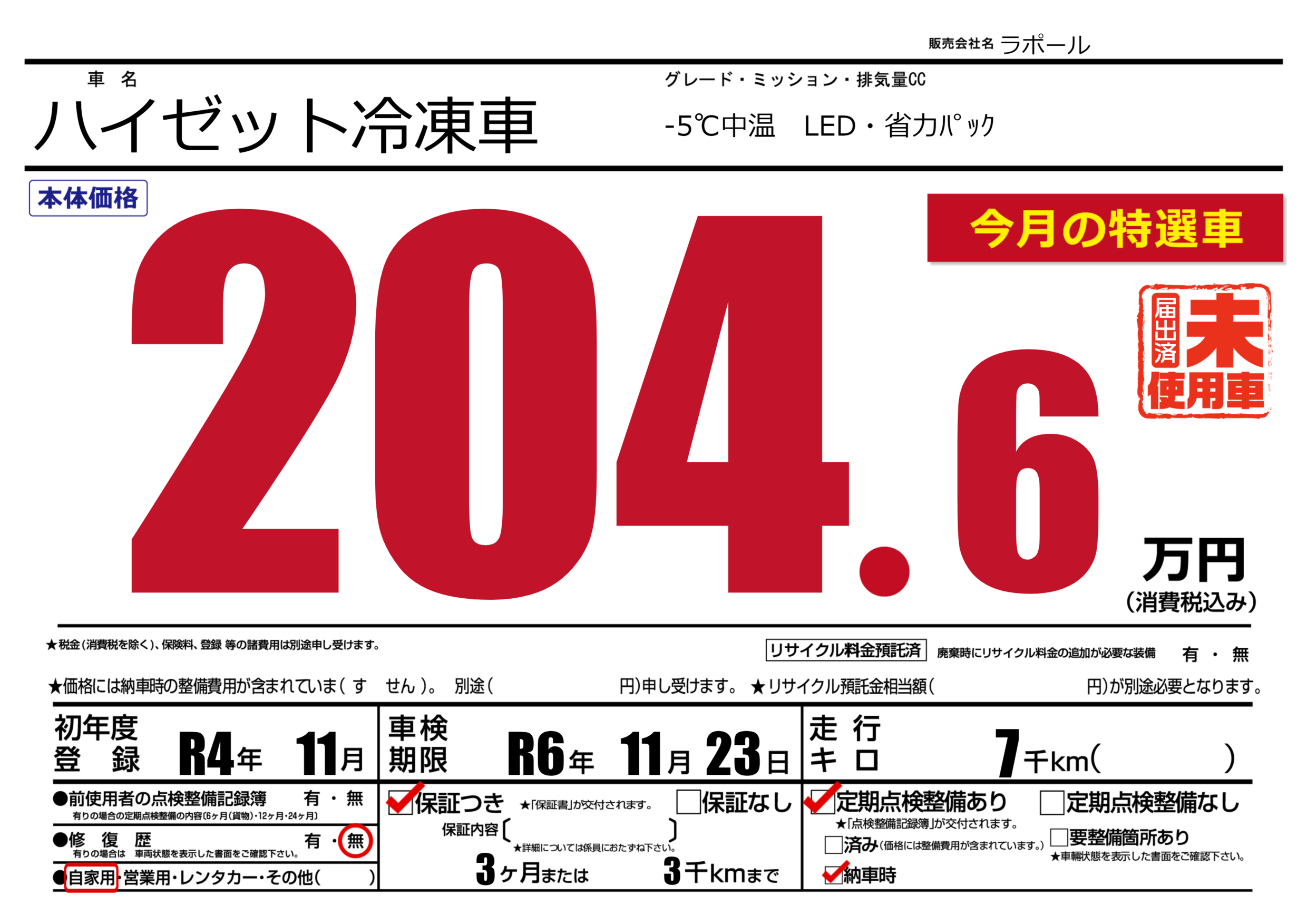 | 走行キロ | 0.7万km | 初年度登録 | R4年11月 |