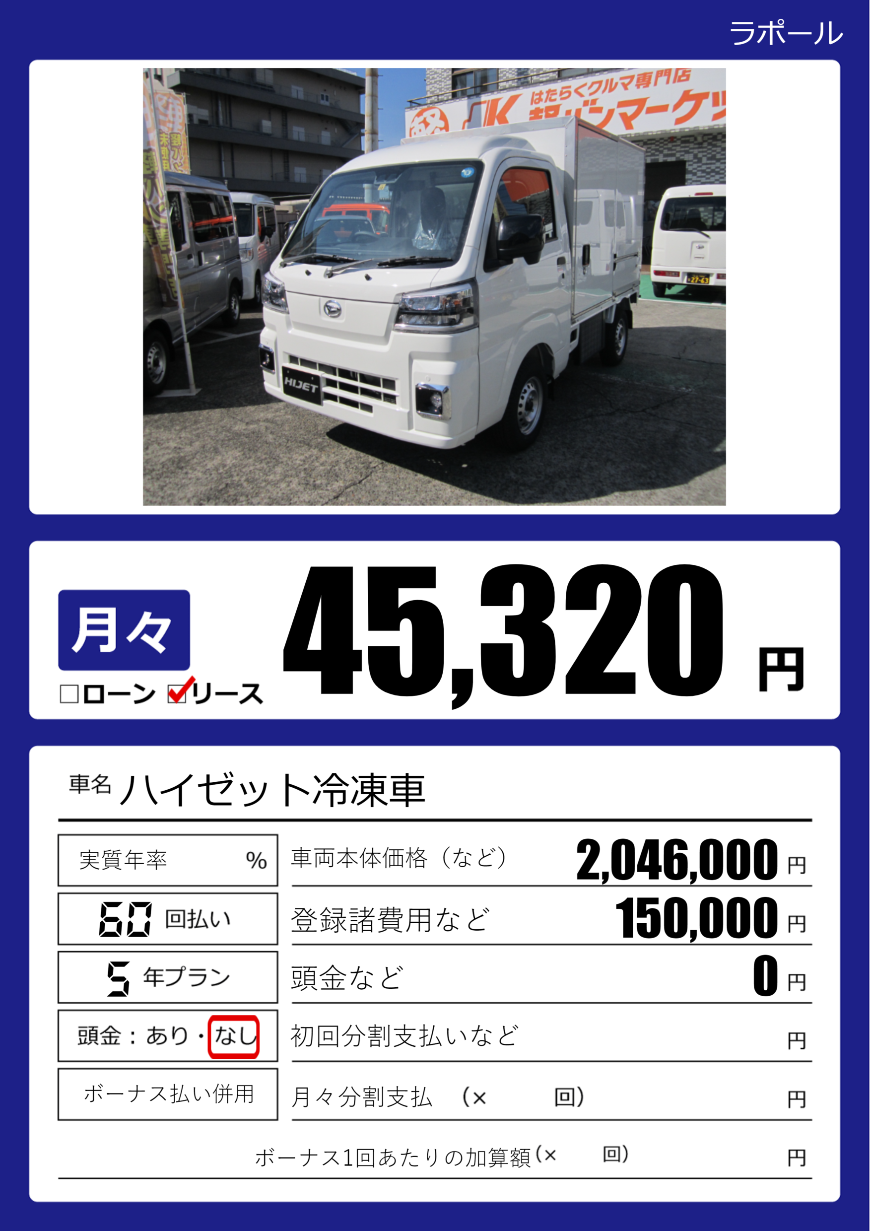 | 車名 | ハイゼット冷凍車 | グレード ミッション 排気量 |