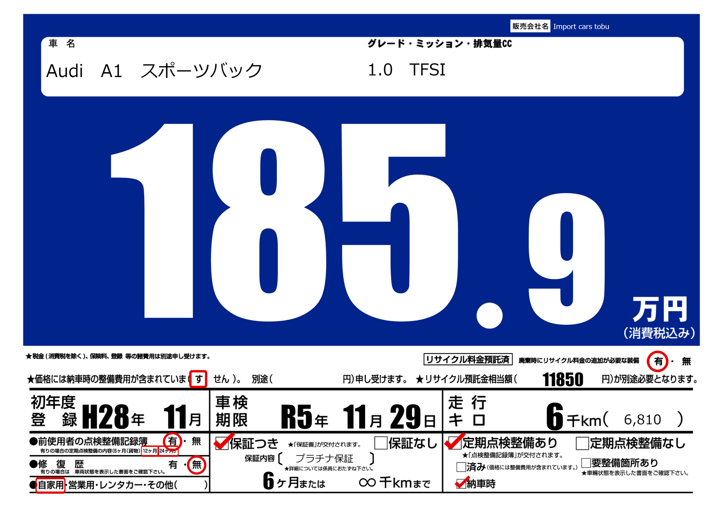 保証付き 保証内容( プラチナ保証) 6ヶ月または(∞)千kmまで |