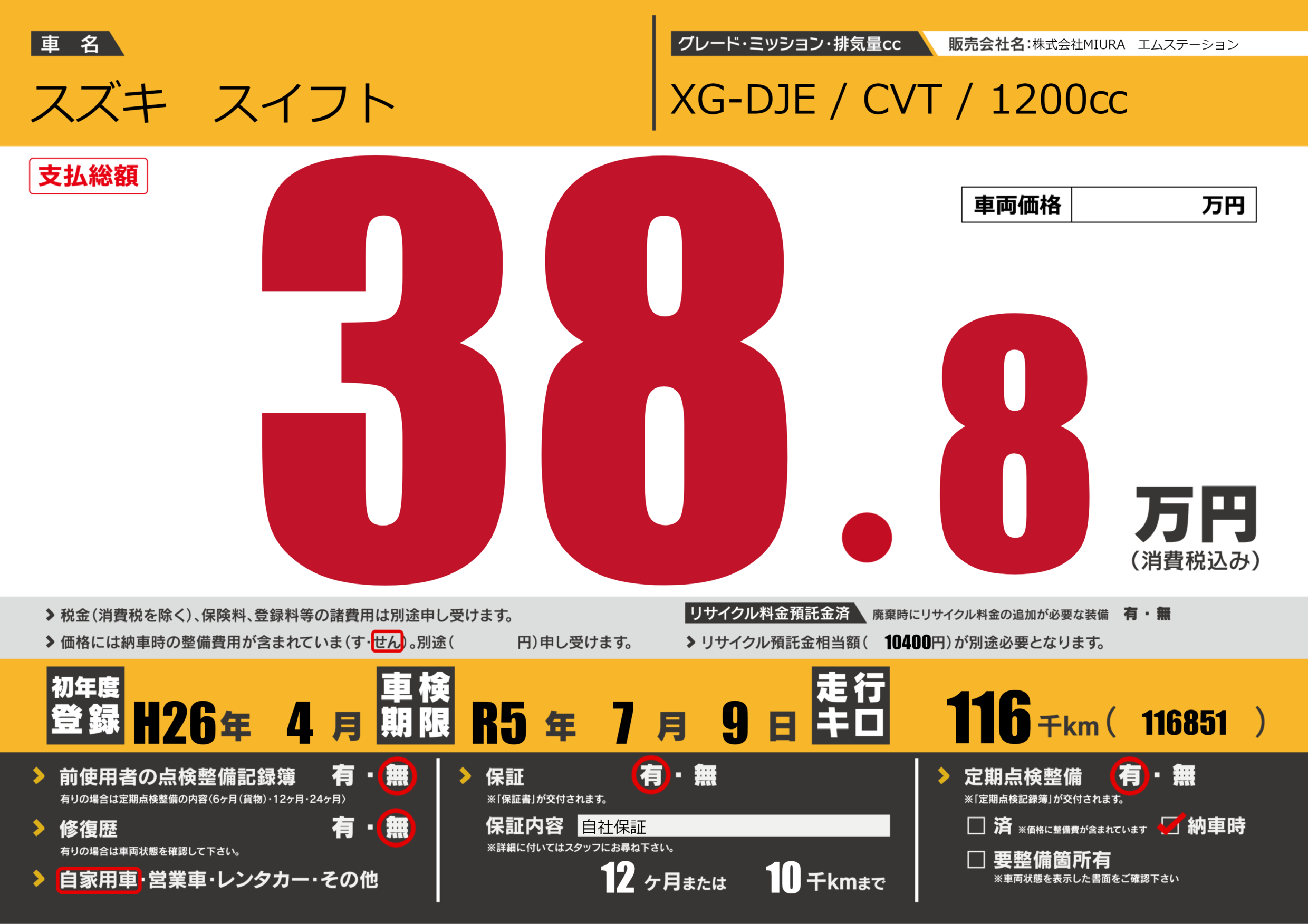 保証付き 保証内容(自社保証) 12ヶ月または(10)千kmまで |