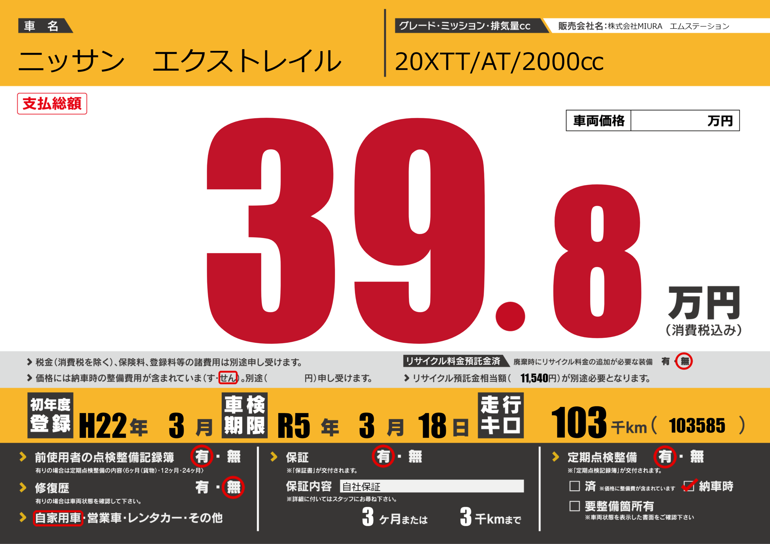保証付き 保証内容(自社保証) 3ヶ月または3千km |