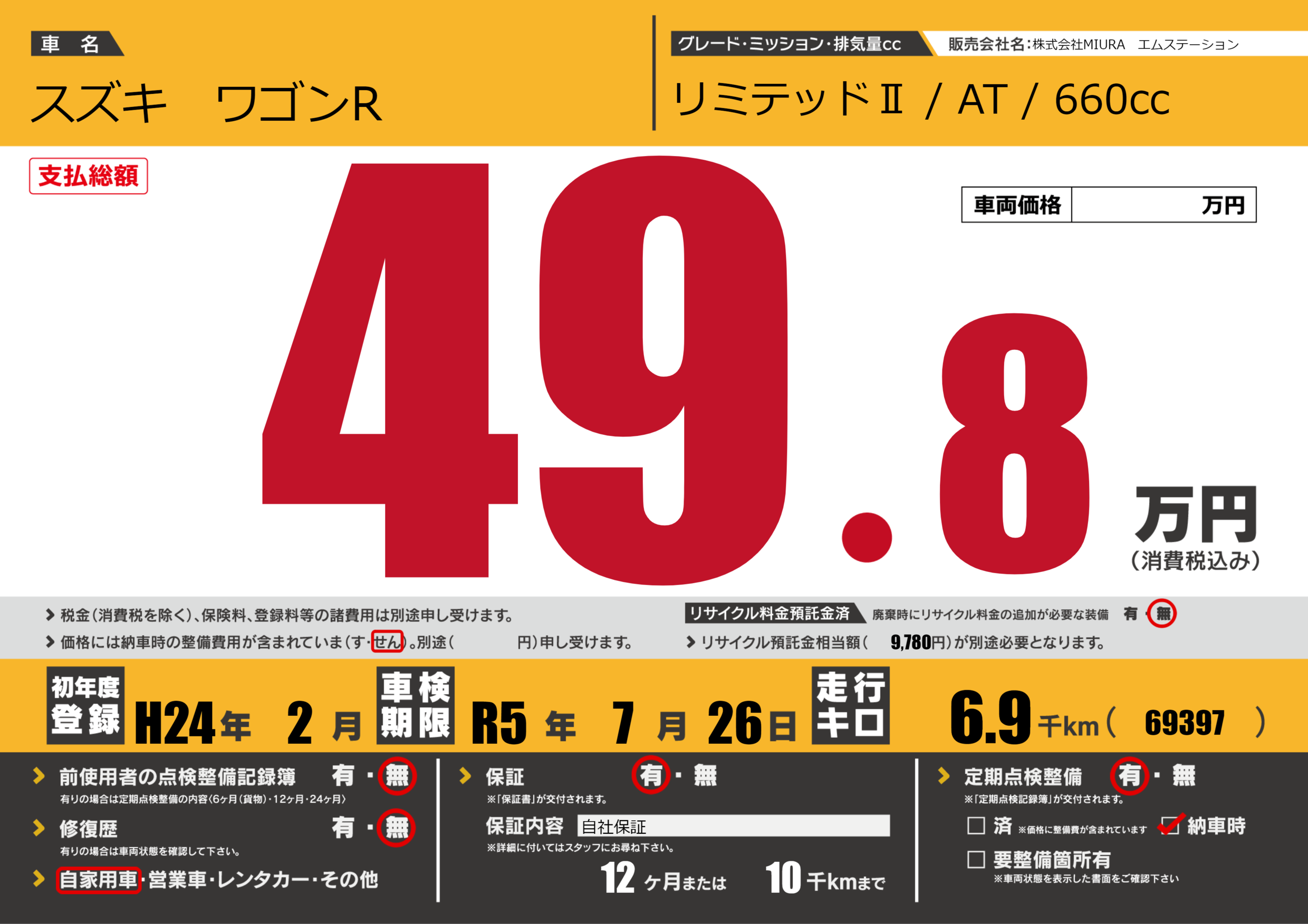 | 車名 | スズキ ワゴンR | グレード ミッション 排気量 |