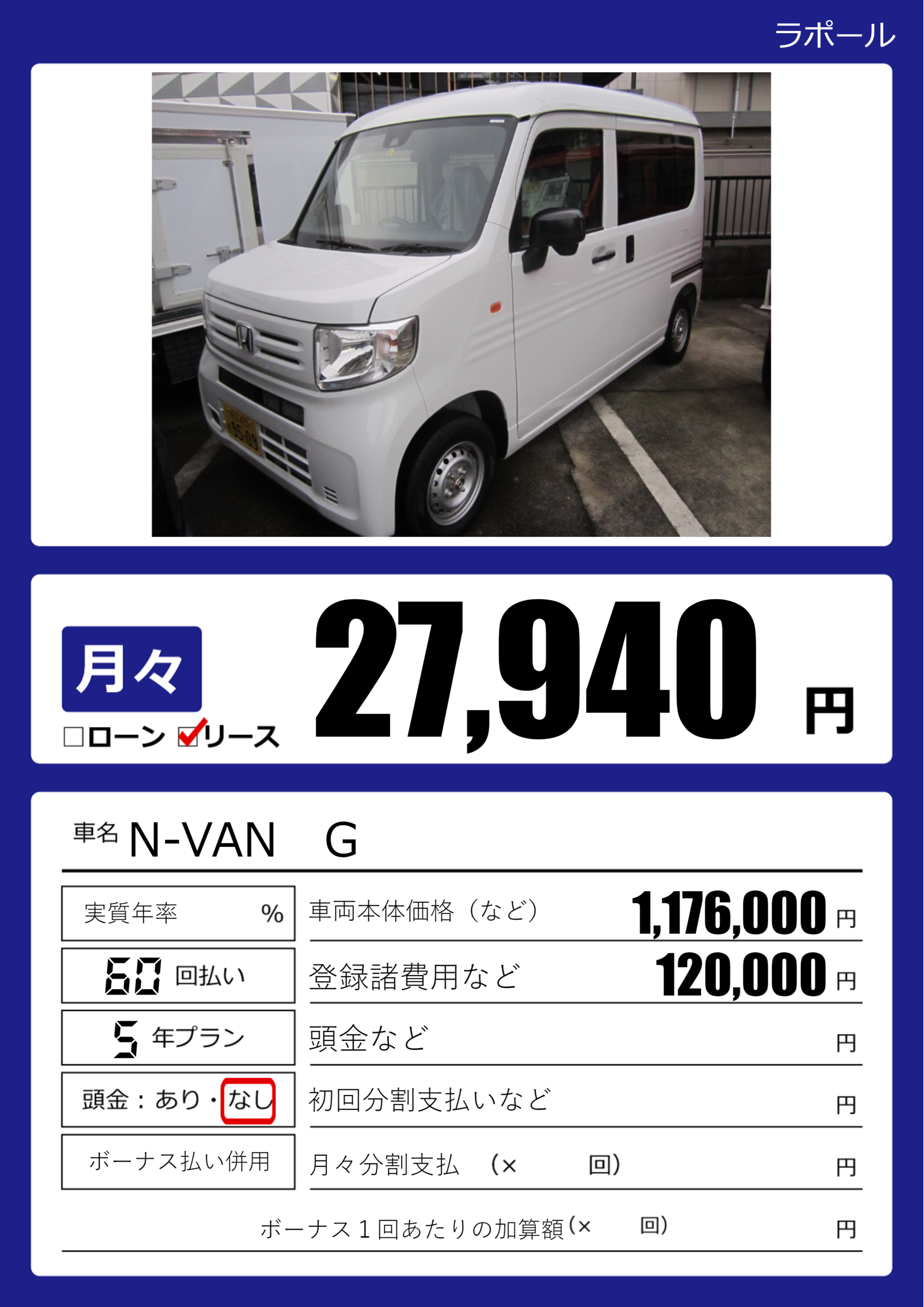 | 車名 | N-VAN G | グレード ミッション 排気量 |