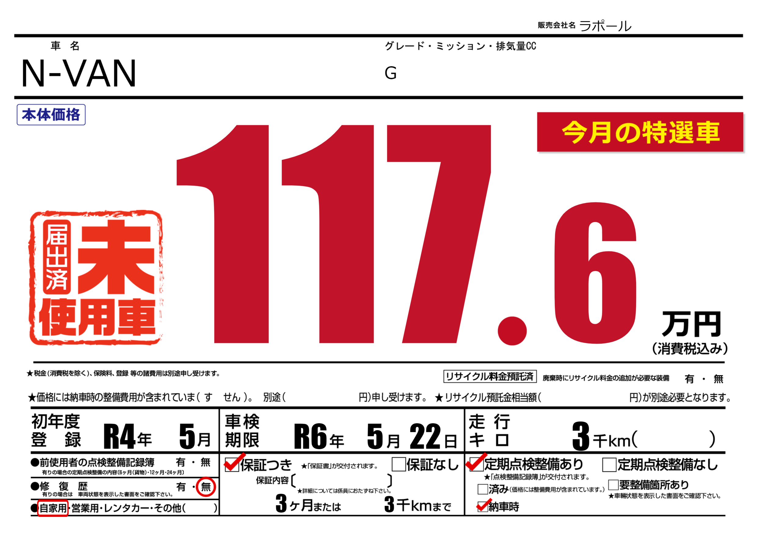 | 車名 | N-VAN | グレード ミッション 排気量 |