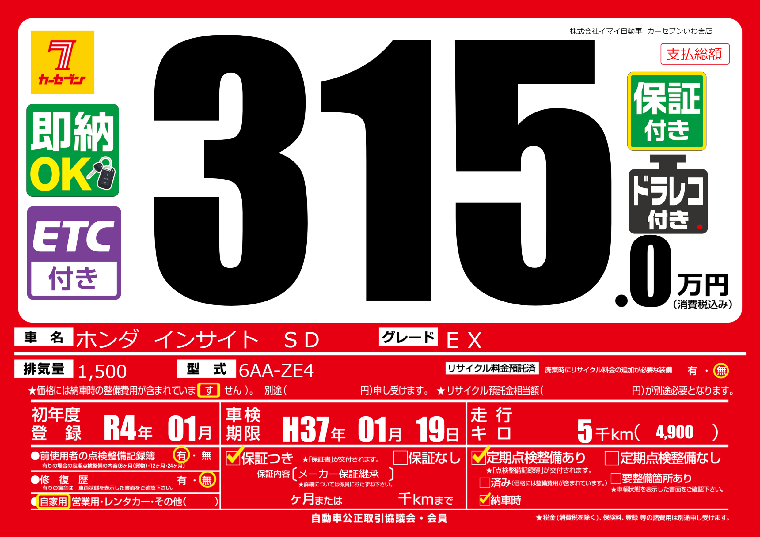 | 走行キロ | 0.5万km | 初年度登録 | R4年01月 |