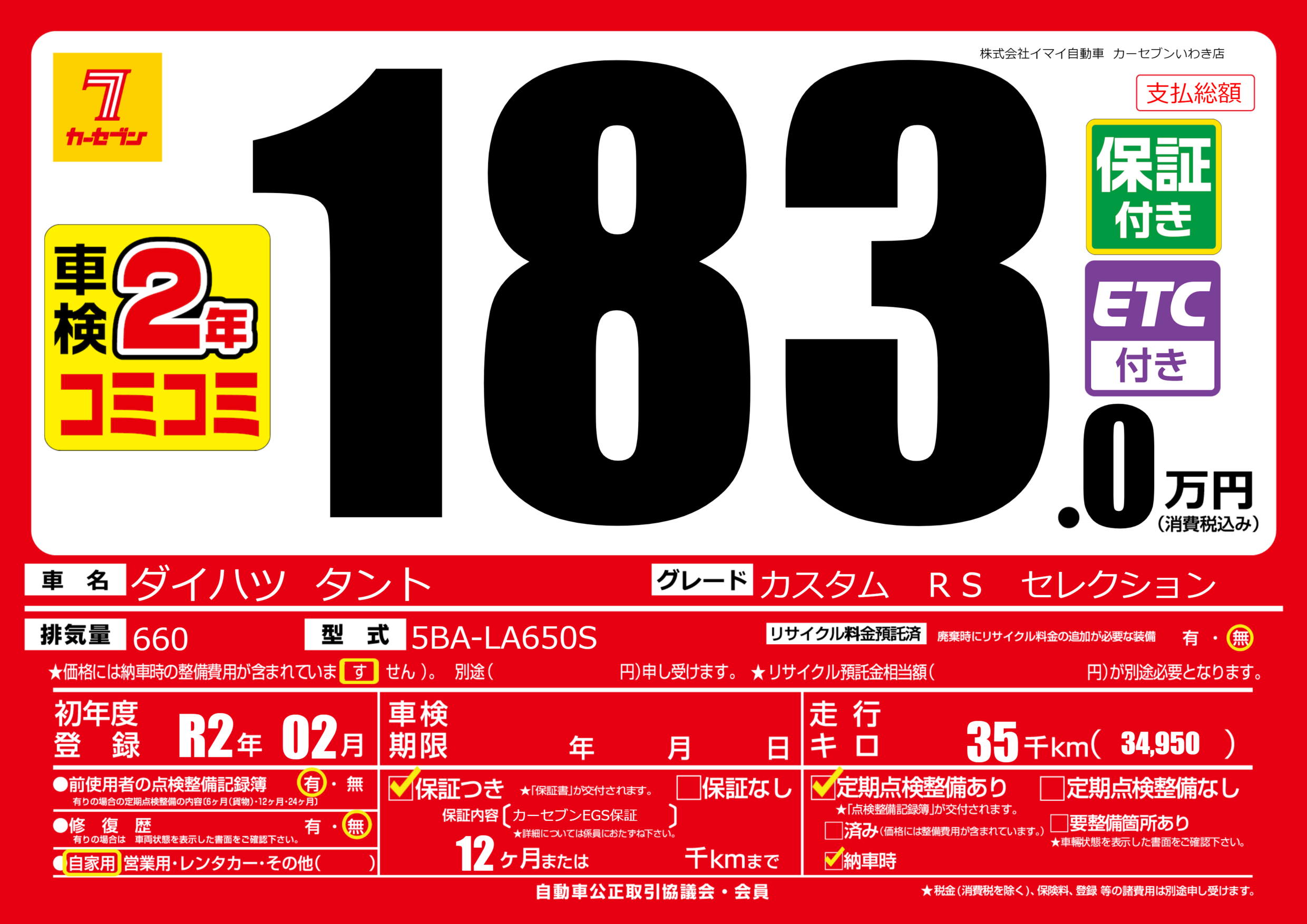 | 走行キロ | 3.5万km | 初年度登録 | R2年02月 |