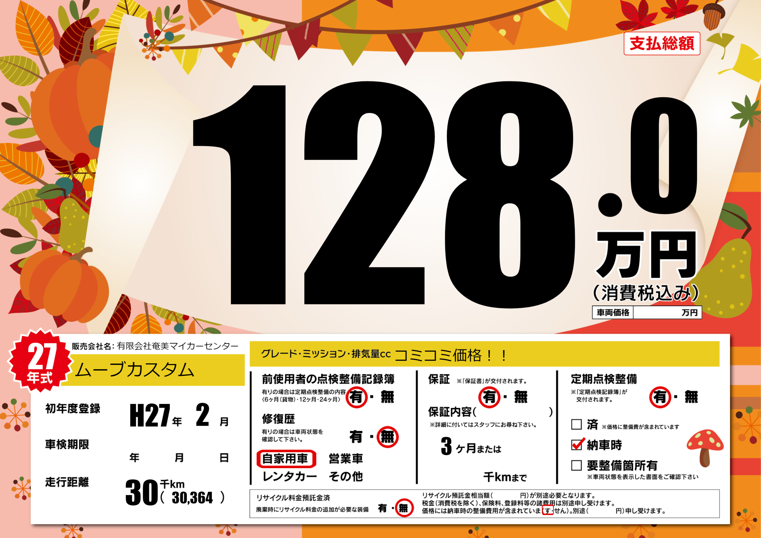 | 走行キロ | 3万km | 初年度登録 | H27年2月 |