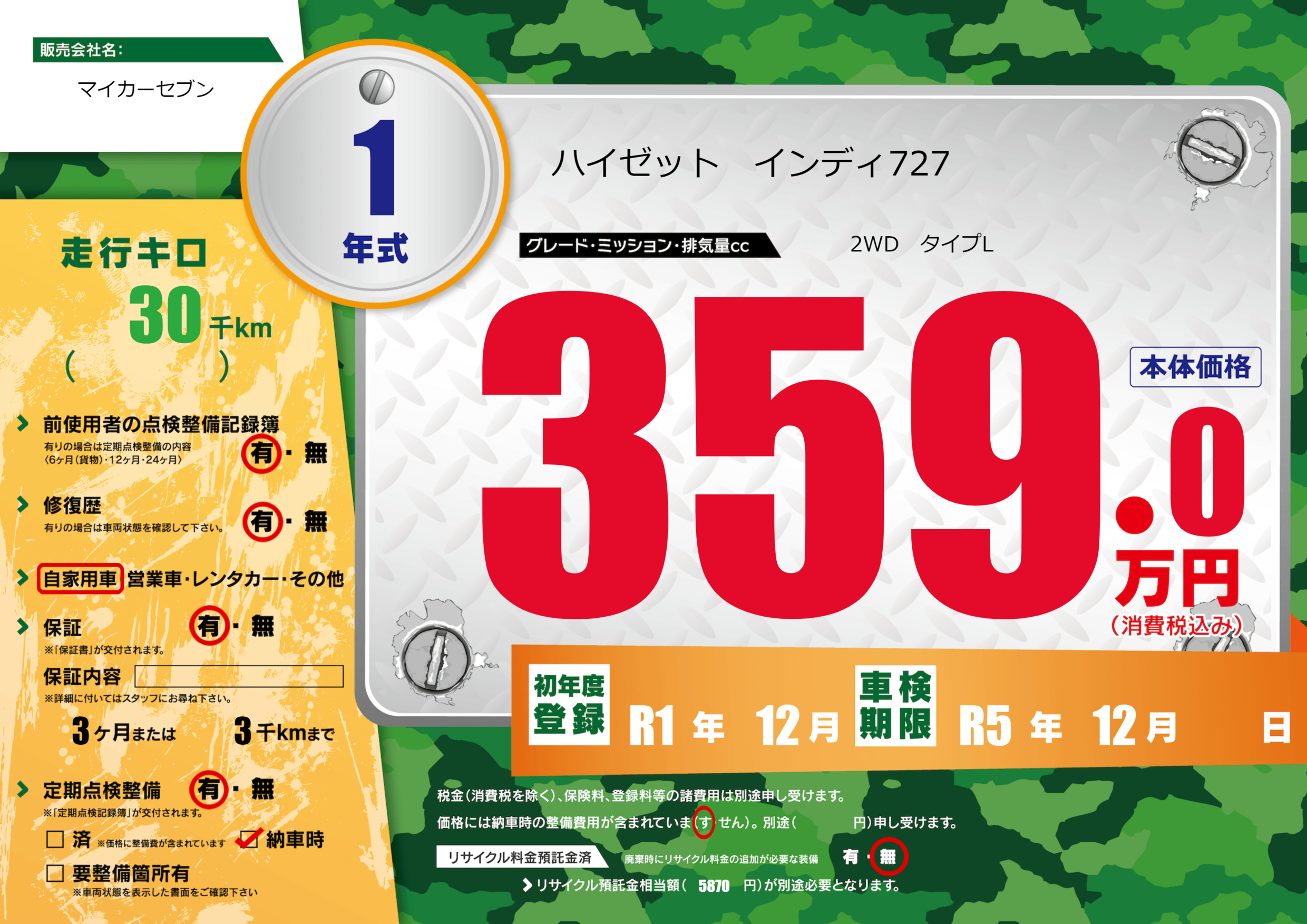| 車検制限 | R5年 12月 - 日 | ||