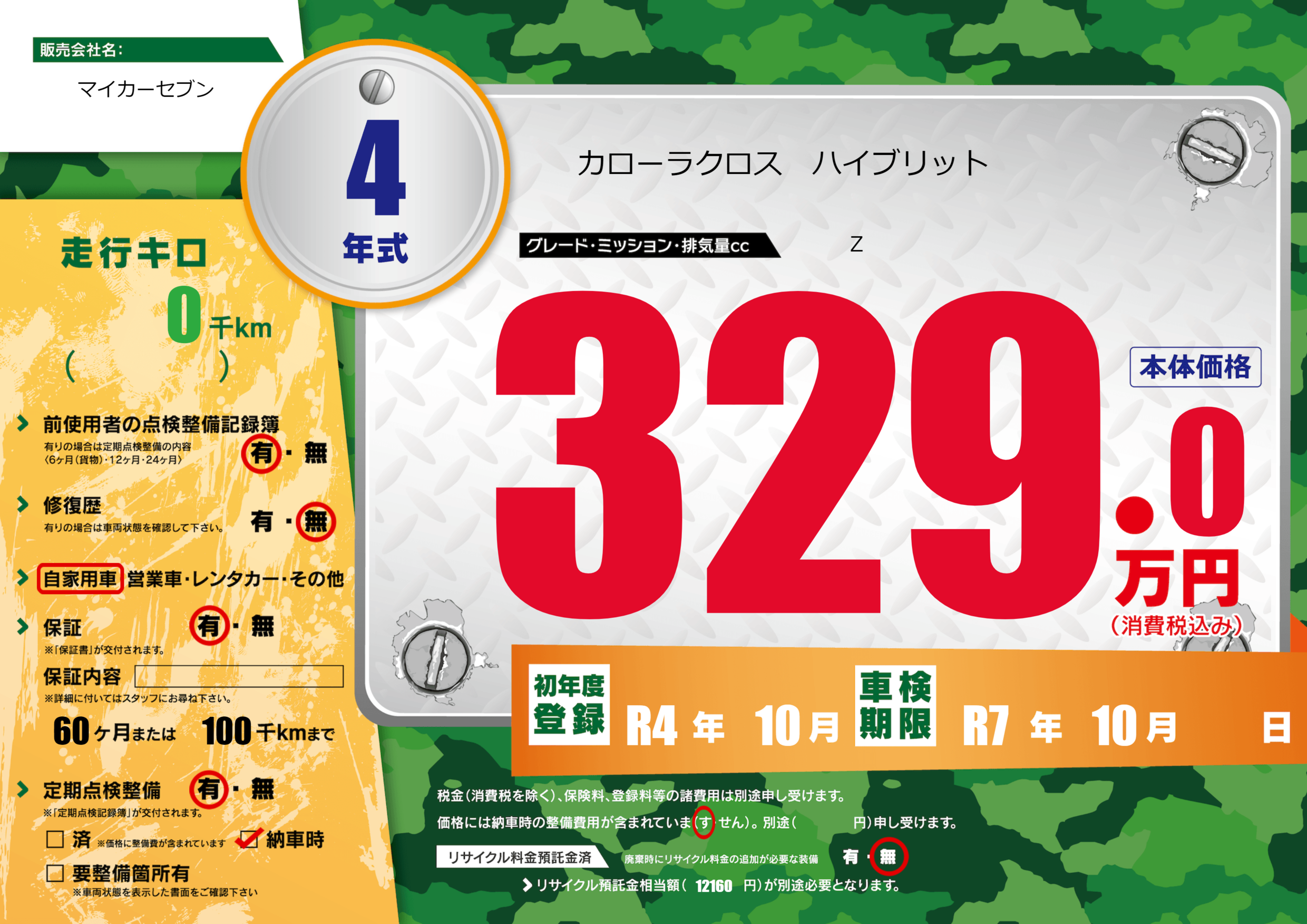 | 車名 | カローラクロス ハイブリット | グレード ミッション 排気量 |