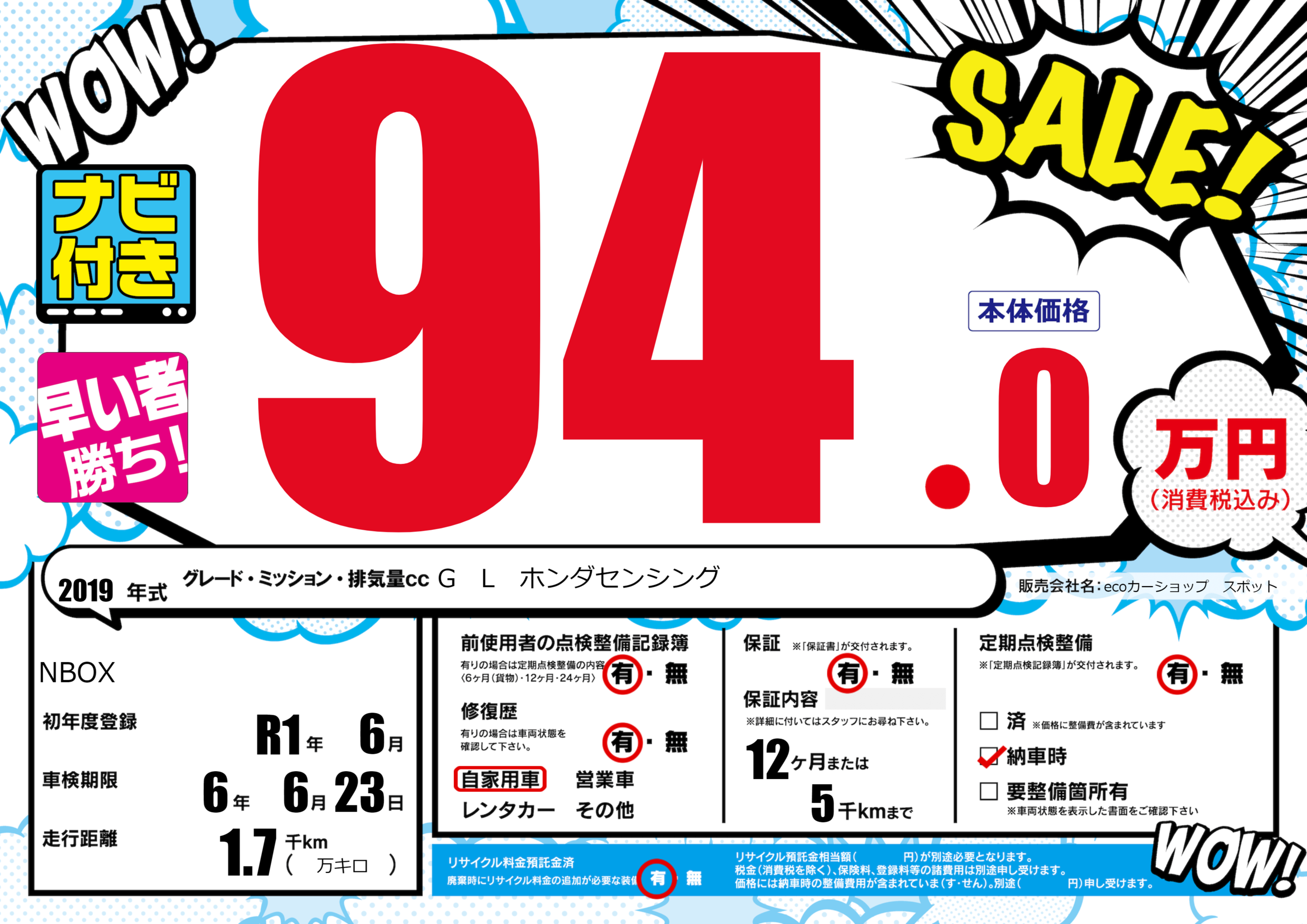 | 車名 | NBOX | グレード ミッション 排気量 |